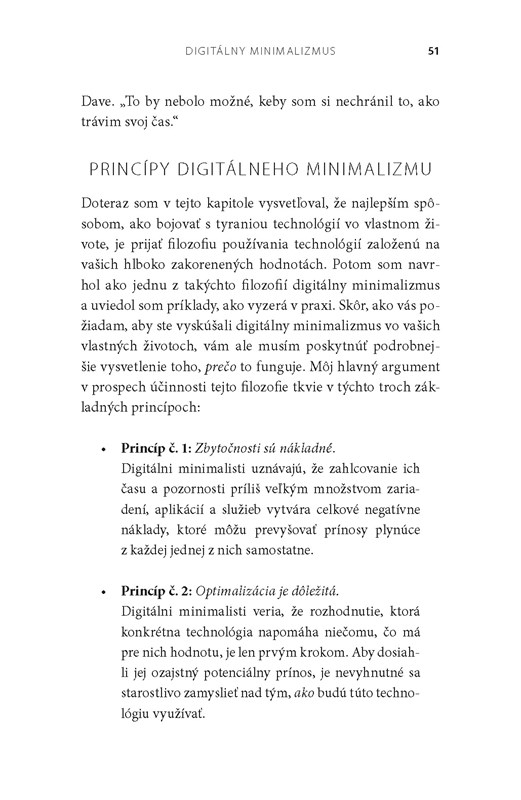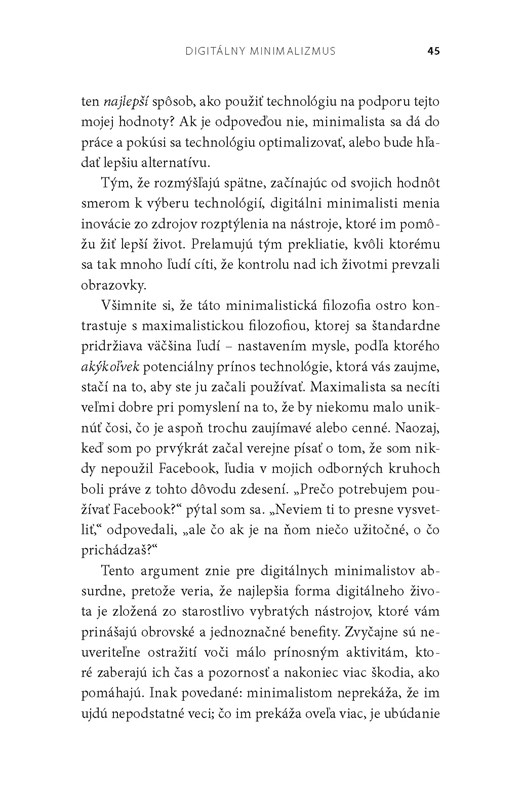Teraz Newport toto nenápadné hnutie pomenúva a presvedčivo vysvetľuje, prečo je v našom technológiami preplnenom svete nevyhnutné. Bežné tipy a rady, ako napríklad vypnúť si upozornenia alebo občas si dať digitálny pôst, nie sú dostatočne dôsledné na to, aby nám pomohli opäť prevziať kontrolu nad našimi technologickými životmi, a snahy úplne sa od technológií odpojiť nám komplikujú potreby našich rodinných príslušníkov, priateľov či práce. To, čo namiesto toho potrebujeme, je premyslená metóda, vďaka ktorej sa rozhodneme, ktoré nástroje používať, na aké účely a za akých podmienok.