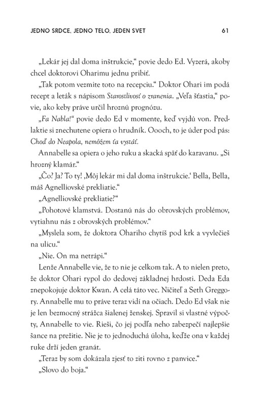 Našťastie, na svojej ceste Amerikou nie je sama a spoločnosť (hlavne morálnu) jej robí dedo Ed. Starkého som si obľúbila, pretože to nebol žiaden zbytočne nóbl dedko, ale príjemný, vtipný, miestami preafektovaný dedušo, s ktorým by ste chceli tráviť prázdniny. Jeho talianske frázy neraz odľahčili situácie, do ktorých sa s Anabelle dostali.