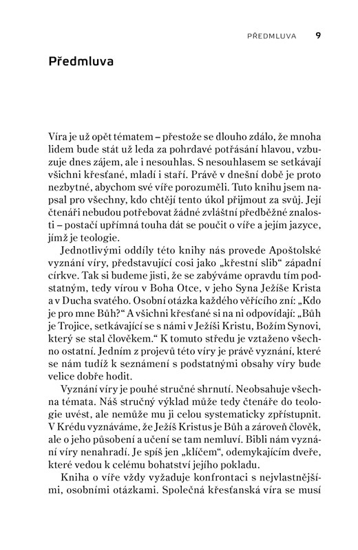 Věřící křesťané dnes stojí tváří v tvář nejrůznějším otázkám a výzvám. V rozhovoru s ateisty či přívrženci jiných náboženství musejí umět srozumitelně vyložit, o co v křesťanství jde. Na pomoc jim přichází tato kniha, které vykládá krok za krokem apoštolské krédo neboli vyznání víry a jeho zásadní věroučné pravdy tak, aby byly zajímavé nejen pro věřící, ale i pro ty, kdo stojí mimo církve či k nim chovají odstup. S pomocí apoštolského kréda, jež představuje cosi jako křestní slib západní církve, shrnuje autor, ve Vídni působící teolog Hubert Philipp Weber, nejzásadnější otázky víry v Boha, jeho Syna Ježíše Krista a Ducha svatého. Jeho kniha se opírá nejen o výklad Bible a nejdůležitějších textů církevní nauky, ale také o lidskou zkušenost.