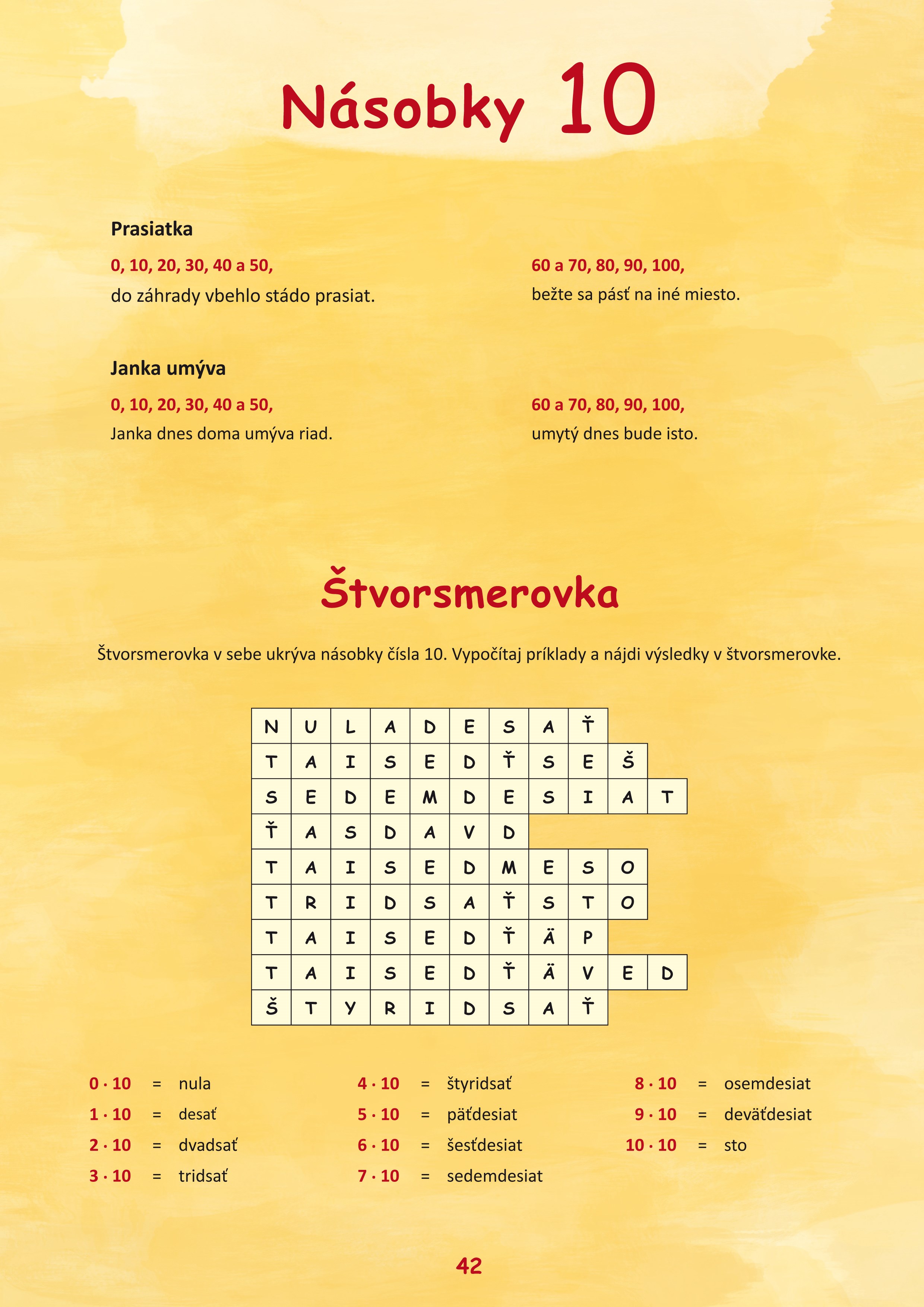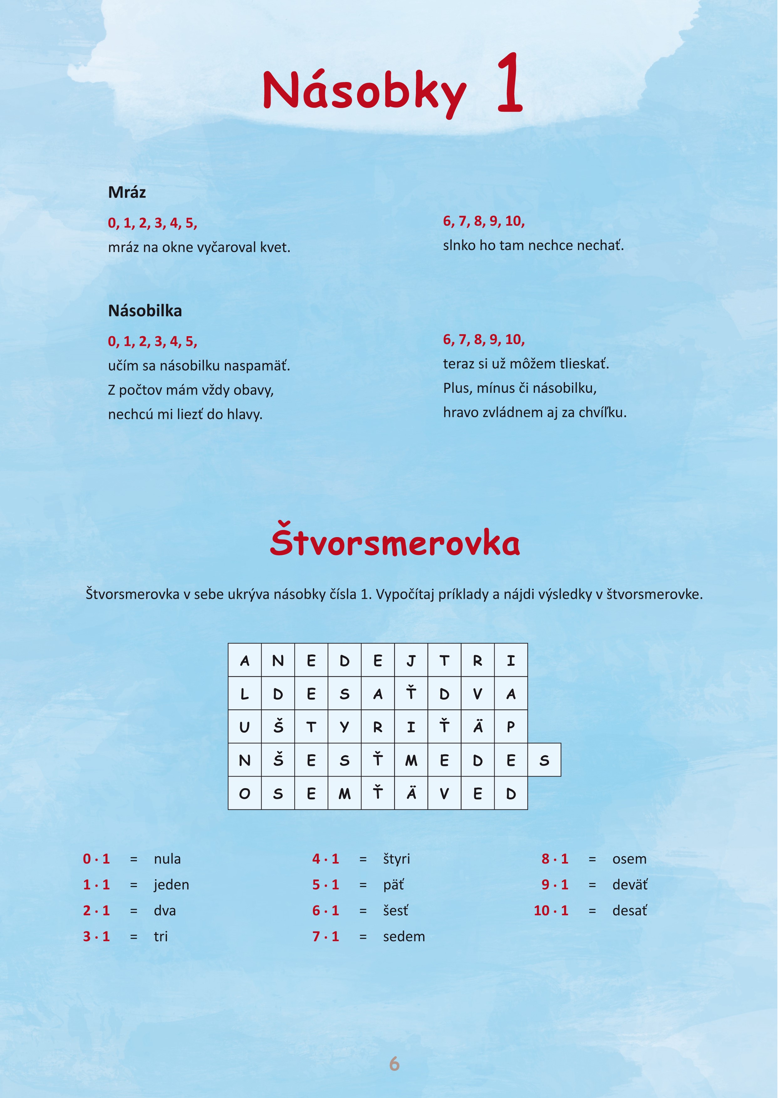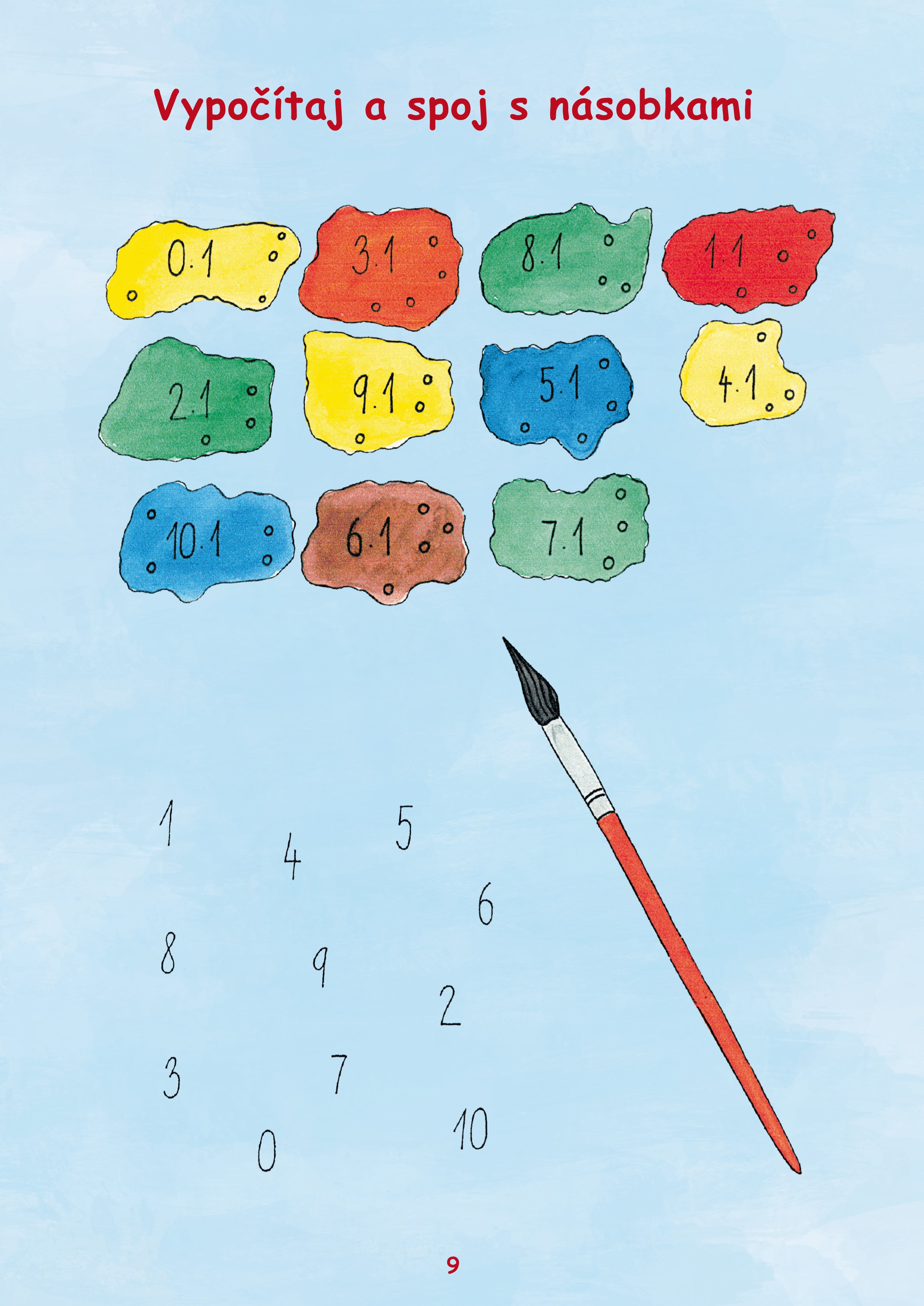 Publikácia Násobilka – Veselé počty s klaunom Matejom obsahuje námety na precvičenie násobilky od 0 do 10: