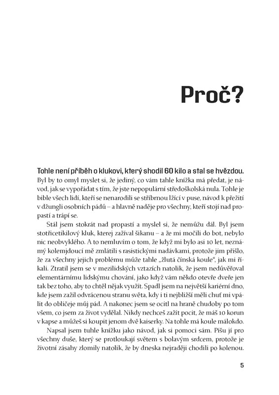 Měl jsem 130kg. Spolužáci na mě plivali. Nikdo nevěřil, že budu zpívat. Neposlouchal jsem je. Věřil jsem. A dokázal to! Tohle není příběh kluka, který shodil 60 kilo a stal se hvězdou. Byl by omyl myslet si, že jediný, co vám tahle knížka má předat, je návod k vypořádání se s tím, že jste nepopulární středoškolská nula. Je biblí všech, kteří se nenarodili se stříbrnou lžící v puse, návod k přežití v džungli osobních pádů a nadějí pro ty, co se trápí.