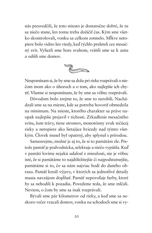 Jeho matka bola opatrovateľka a otec cestár. Detstvo mu zaplnila vôňa asfaltu, ktorá sa šírila po pracovnej dobe z unaveného tela jeho otca. A zaplnili mu ho aj spoločné rybačky na úhora. Z odstupu hľadí na dlhé nočné chvíle, ktoré strávili pri rieke neďaleko starorodičovského domu, vidí pred sebou svojho mĺkveho otca, ktorý nie je o nič menšou záhadou ako tajomný úhor.