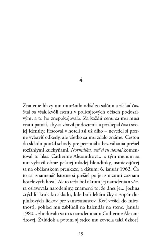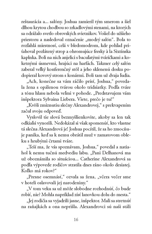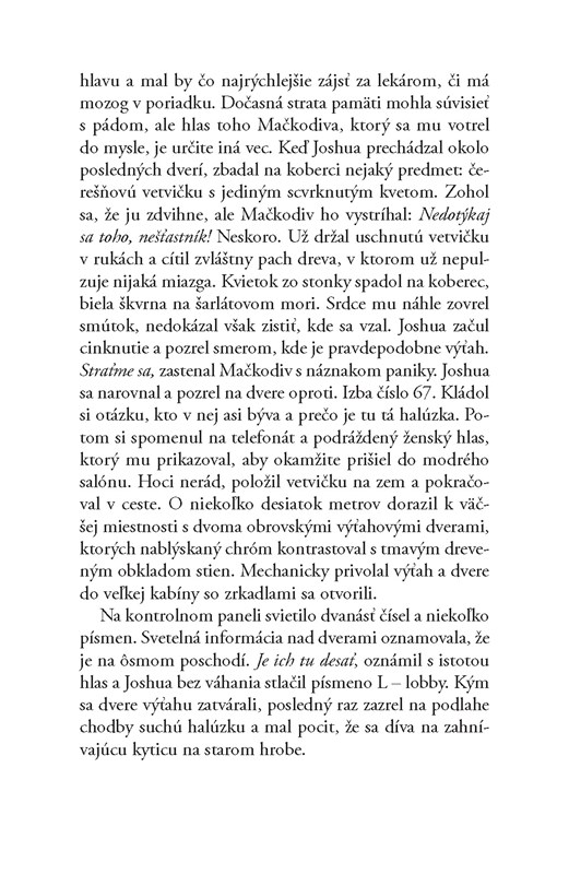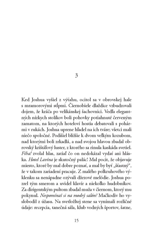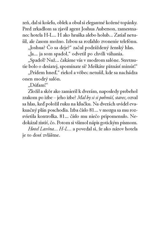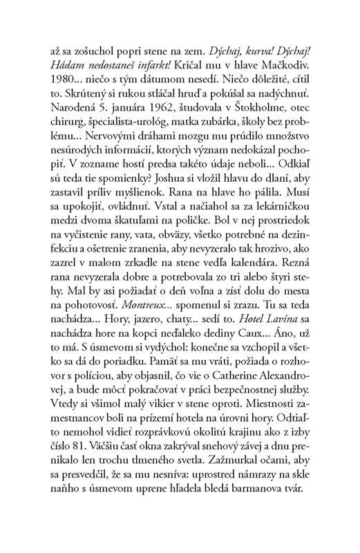 Niko Tackian je na poli detektívok etablovaný už niekoľko rokov a z jeho textu cítiť, že nie je žiaden nováčik. Už prvé vety románu vás navnadia, uvedú do nezvyčajnej situácie a nastolia dynamické tempo. To sa udržuje po celý čas, čo je dané jednak krátkymi kapitolami (cca trojstranovými), jednak nespoľahlivosťou plynúcou zo spôsobu rozprávania. Hlavná postava sa totiž zmieta medzi rokmi 1980 a 2018. Ako je to možné? Joshuu Obersona spoznávame ako ochrankára v Hoteli Lavína, kde sa potýka so zmiznutím mladého dievčaťa. Vlastná zmätenosť mu nepridáva na pokoji, v mysli sa mu vynára viac otázok než odpovedí, a keď nemôže veriť ani sám sebe, ako môže dôverovať ostatným? Po tom, ako ho zasype lavína a istý čas strávi v kóme, sa po prebudení ocitne... v budúcnosti? Alebo je všetko celkom inak a iba sa s ním pohráva jeho pamäť a všetko, čo sa mu stalo, bol len sen? Nájsť cestu z tohto komplikovaného kruhu mu pomáha kolegyňa Sibylle, pričom východiskovým bodom môže byť spis k prípadu neznámej ženy... Hotel Lavína je charakterizovaný ako snový triler a tento pojem napĺňa vrchovato. Osobne nemám rád hmlisté príbehy, kde si nie ste istí, čo sa vlastne deje, ale tu mi to neprekážalo. Veľmi mi totiž vyhovujú krátke úseky textu a román nie je navyše rozsiahly, takže dej rýchlo odsýpa a zbytočne sa nenaťahuje. Rovnako oceňujem aj mrazivú atmosféru zasnežených hôr a svojské postavy, sprevádzajúce Joshuu v jeho predstavách. Nikovi Tackianovi sa podarilo aj na malom priestore vyrozprávať veľký príbeh, blízky svojím vyznením aj severskej literatúre. Francúzi opäť dokazujú, že tento žáner je takisto ich doménou, a je skvelé, že vydavateľstvo Lindeni s nimi zoznamuje aj slovenských čitateľov.