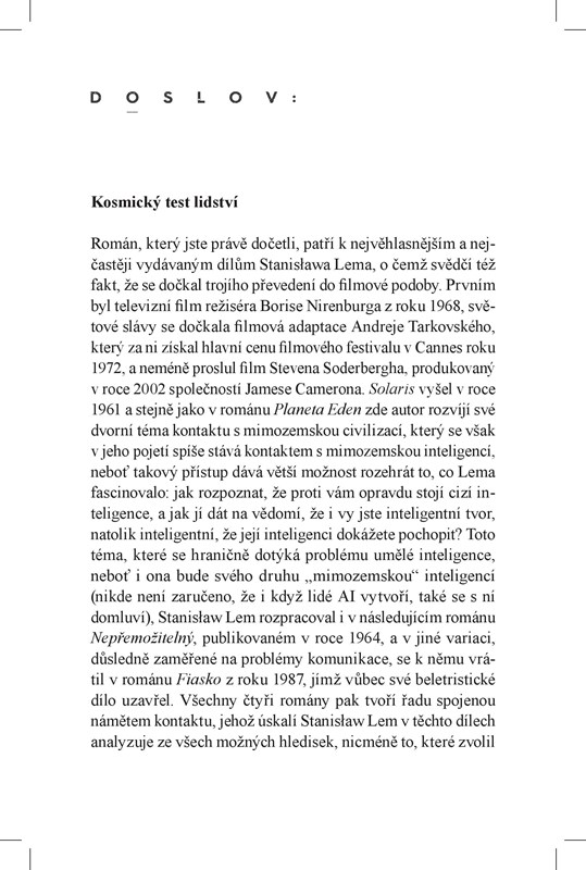 „Román patří k nejvěhlasnějším a nejčastěji vydávaným dílům Stanisława Lema, o čemž svědčí též fakt, že se dočkal trojího převedení do filmové podoby. Prvním byl televizní film režiséra Borise Nirenburga z roku 1968, světové slávy se dočkala filmová adaptace Andreje Tarkovského, který za ni získal hlavní cenu filmového festivalu v Cannes roku 1972, a neméně proslul film Stevena Soderbergha, produkovaný v roce 2002 společností Jamese Camerona. Solaris vyšel v roce 1961 a stejně jako v románu Planeta Eden zde autor rozvíjí své dvorní téma kontaktu s mimozemskou civilizací, který se však v jeho pojetí spíše stává kontaktem s mimozemskou inteligencí, neboť takový přístup dává větší možnost rozehrát to, co Lema fascinovalo: jak rozpoznat, že proti vám opravdu stojí cizí inteligence, a jak jí dát na vědomí, že i vy jste inteligentní tvor, natolik inteligentní, že její inteligenci dokážete pochopit?“ Z doslovu Františka Novotného.