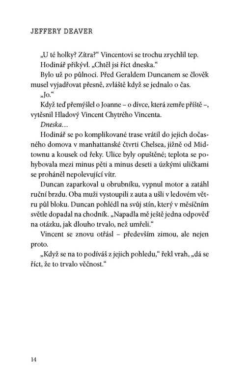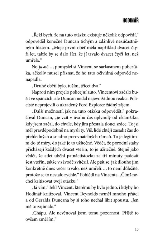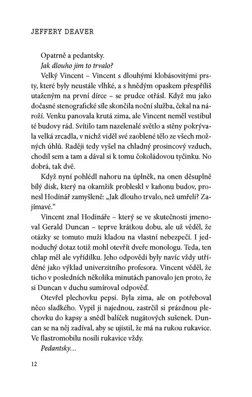 Lincoln postupně zjišťuje, že Hodinář možná není jen šílenec oddávající se vražednému běsnění, nýbrž mnohem úskočnější zločinec, než si kdo dokázal představit. V souboji dvou geniálních mozků čeká na čtenáře více zápletek a nečekaných zvratů než v předchozích Deaverových knihách – a také střetnutí s nejděsivějším a nejuhrančivějším zločincem, jakého kdy tento autor stvořil."