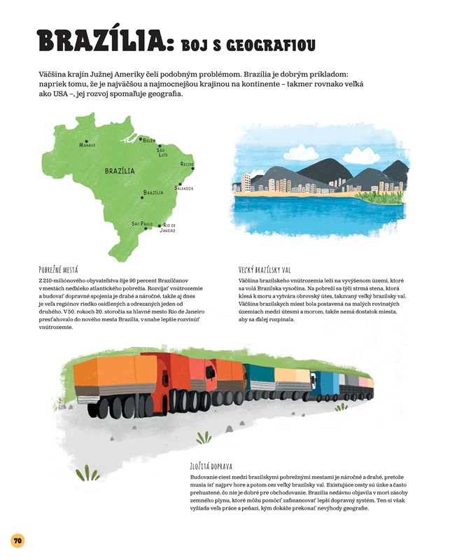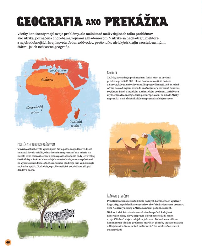 Nie, tú knihu len tak ľahko nepustí z ruky nikto. Veď aj ja sa už len pozriem na mapu Afriky, kde pre názorné porovnanie veľkosti ilustrátorky Grace Eastonová a Jessica Smithová zakreslili všetky krajiny, čo by sa do nej zmestili: USA, Indiu, Čínu, Španielsko, Francúzsko, Nemecko, Belgicko, Taliansko, Japonsko a Veľkú Britániu, a ešte ostal kus pre veľkú časť východnej Európy!