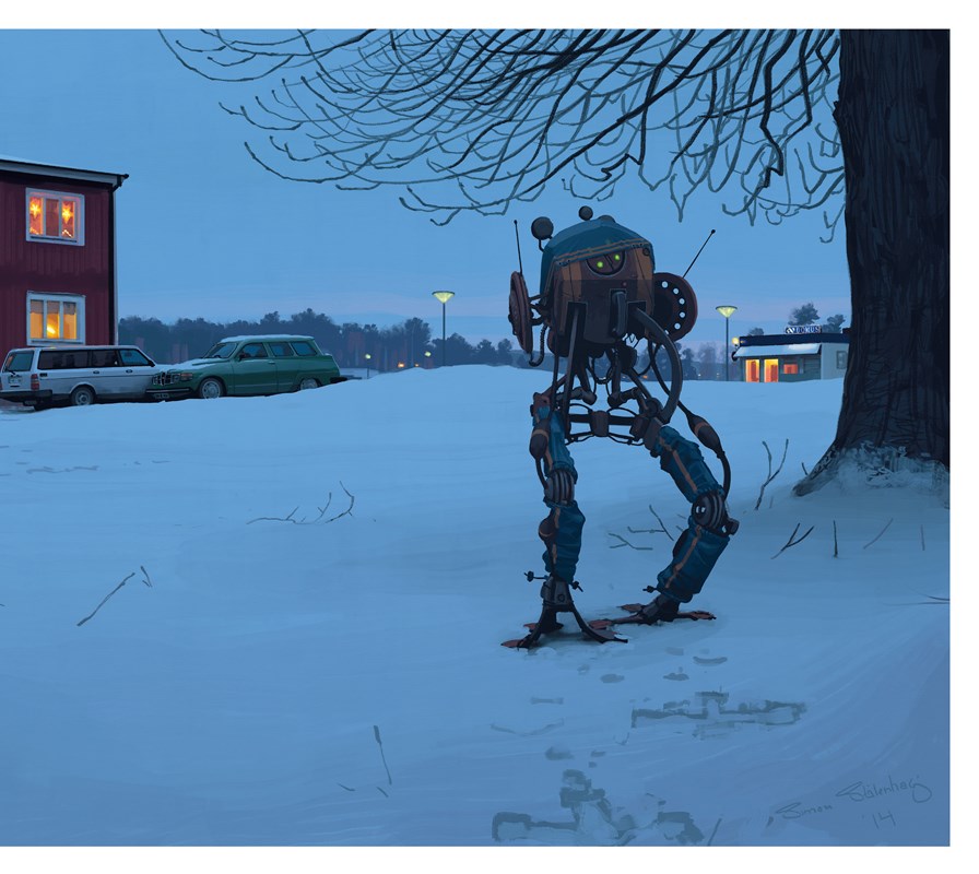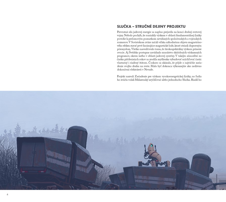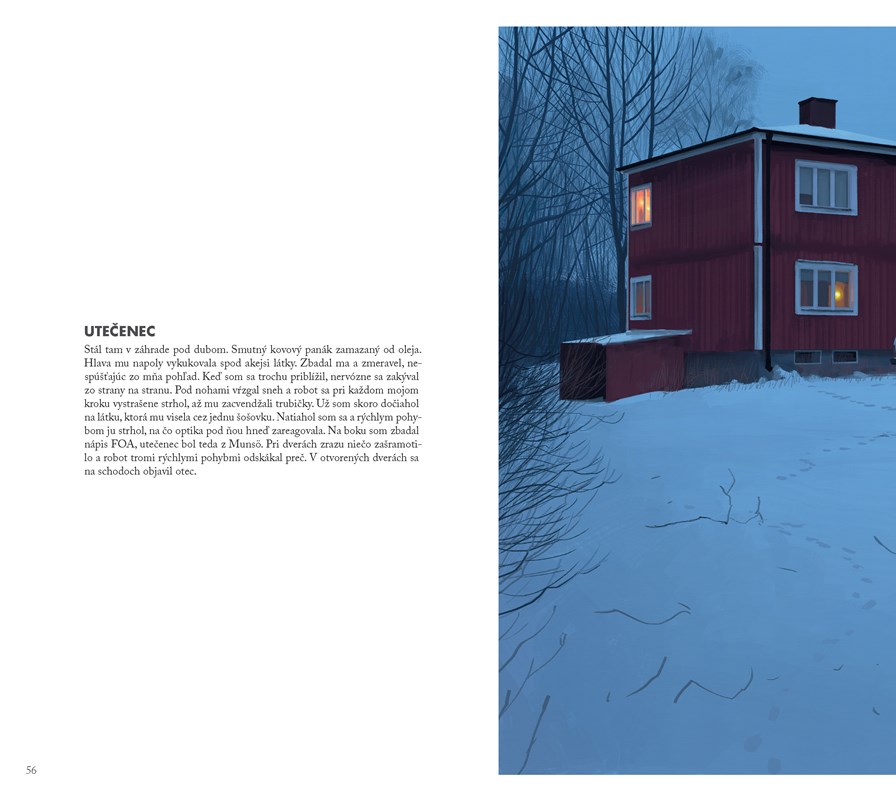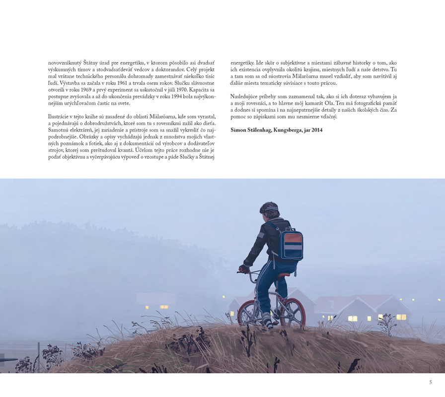 Široké plochy, chmúrnejšia atmosféra. Výjavy doliehajú ako pokročilá fáza spánku v bode zlomu. Ten moment, ktorý si dobre nepamätáte a ráno sa chcete rozpomenúť, pretože v chaose surreálnych obrazov hľadáte orientačný význam. Ako nevedomie zakladá na skúsenosti, ani Simon Stalenhag nemení kurz a nezabúda na realitu, nevytvára novú, naopak, kreatívne ilustruje minulosť, rozširuje jej stigmy a čitateľa necháva v izolovanej pustine plnej abstraktných mechanických figúr. Vynárajú sa, ponúkajú priestor na hru a objavovanie.