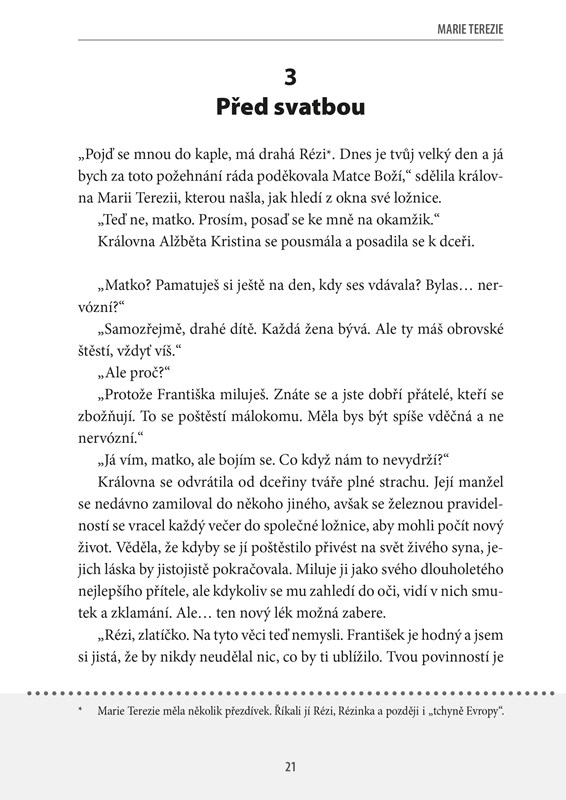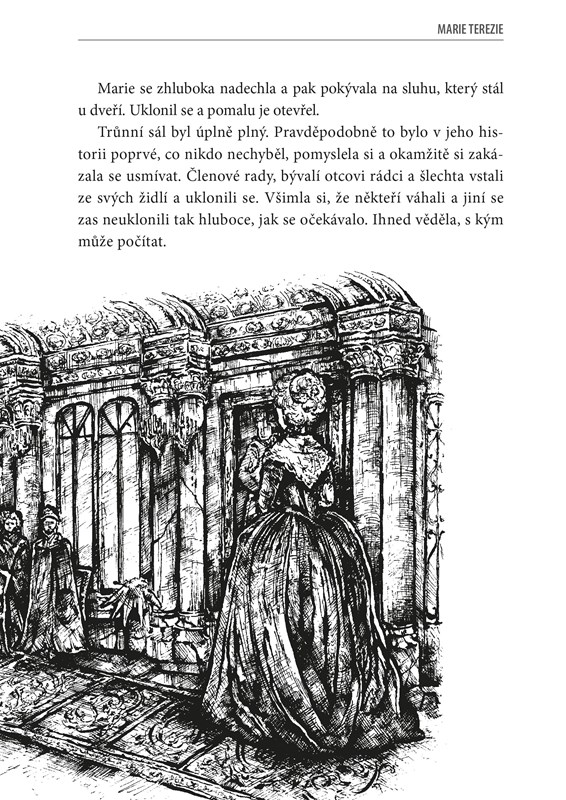 Vládkyně habsburské monarchie, česká a uherská královna… Z učebnic historie se na nás dívá majestátní plavovlasá žena, pravá císařovna. Jaká ale byla doopravdy žena jménem Marie Terezie? Na stránkách knihy máte možnosti nahlédnout do soukromého života jedné z nejmocnějších žen své doby a poznat Marii Terezii jako milující a věrnou manželku, něžnou, ale i přísnou matku.