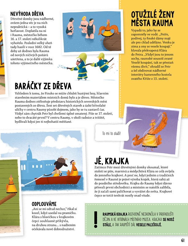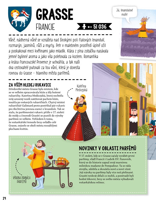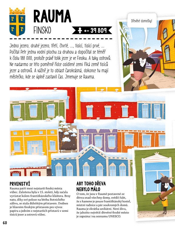 „Ve městech, tam to žije,“ myslíval si kozlík Petr, když na louce přežvykoval zbytky jetele. „Tráva je tam zelenější, sladší a šťavnatější.“ „Jó, takové město, to je jiná,“ kvokala zasněně slepička Klára. „Všude krásné domy, spousta obchodů, ne jako tady na dvoře.“ A protože byli oba nespokojení a chtěli poznat víc, vydali se jednoho dne na cestu za městy. Putovali od severu k jihu, od západu k východu a navštívili města velká, malá, přelidněná, historická i ta úplně moderní. Objevovali jejich krásy a specifika a kolikrát se nestačili divit. Chcete také zažít trochu toho městského dobrodružství? Chvět se zimou v ledovém Jakutsku, zahřát se v pouštním Jazdu či nahlédnout do budoucnosti města dosud neexistujícího? Přidejte se ke zvířecím výletníkům, určitě budou rádi. Stačí jen otevřít stránky bohatě ilustrované knihy a nechat se pohltit ruchem metropolí ze všech koutů světa.