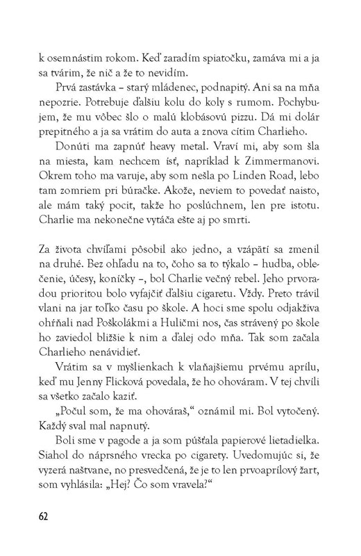 Postava Charlieho bola v mnohých smeroch komplexná. Nedokázala som ho vnímať ako záporáka, ale ani ako úplnú obeť. Autorka sa vyhrala s jeho minulosťou, prinútila nás dostať sa mu do hlavy, a potom sme nemohli už nič ako bezmocne sledovať, čo sa dialo ďalej.