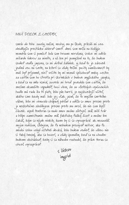 Zápisky, ktoré Ingrid vo svojom denníku skrývala boli výnimočné. Každý jeden totiž venovala niekomu inému. Či už išlo o Caitlin, jej rodičov, chlapca, ktorý sa jej veľmi páčil, ľudí zo školy, niektoré však zároveň venovala aj neživým predmetom či prírodným úkazom. V nich sa práve konkrétnemu adresátovi spovedá o tom, ako sa cíti, čo ju najviac trápi a zároveň zdieľa veci, ktoré by mu nikdy neprezradila.