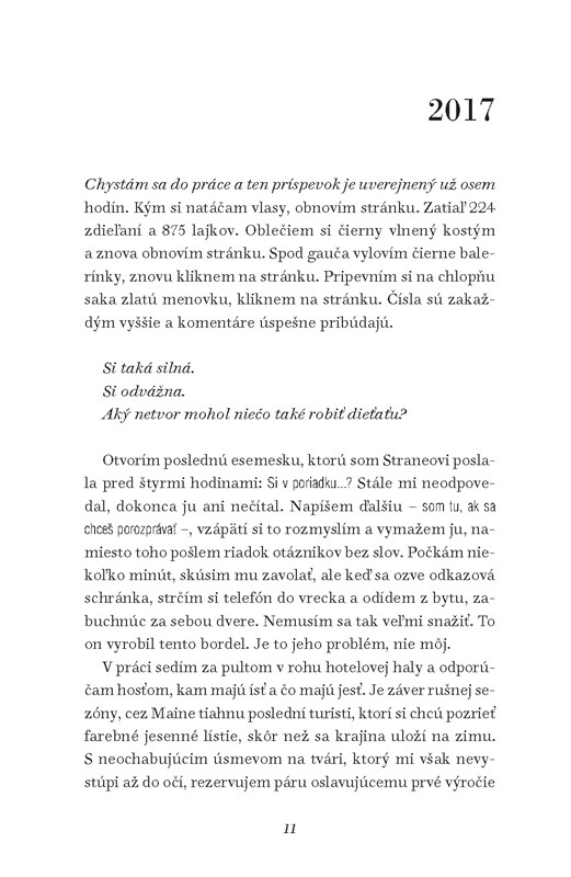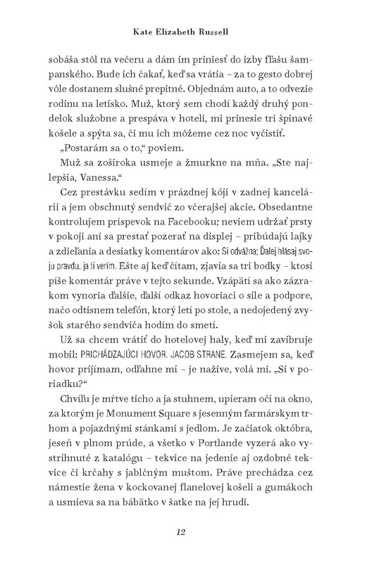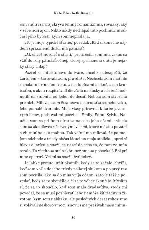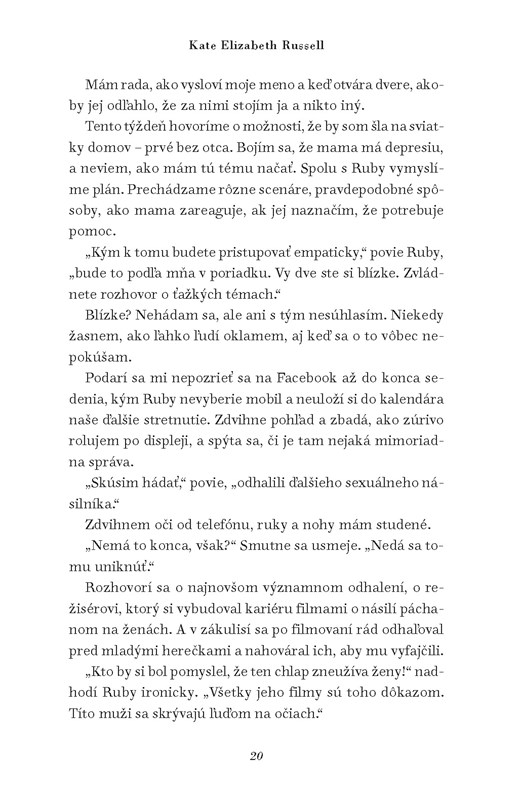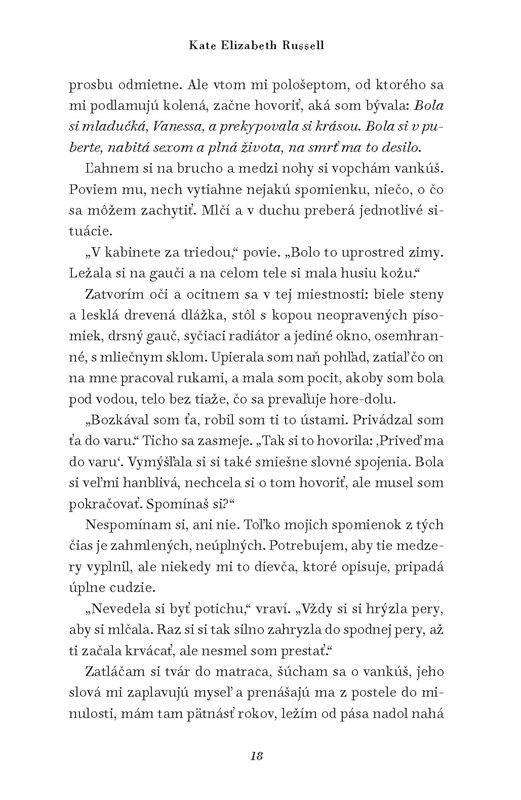 Koľkým dievčatám takto zničili život muži s perverznými chúťkami, bažiaci po nevinnosti?! Sú tu, sú medzi nami, a keď sa niektorá ozve, spoločnosť si neváha do nej kopnúť a obviniť ju z klamstva. A preto mlčia. Na jednej strane sú ako Vanessa, vinia samé seba a nechcú uznať, že boli zmanipulované a na druhej strane sa hanbia a boja výsmechu okolia. Román je šokujúci a môže byť kľúčom k pochopeniu takto zranených žien. Kate Elizabeth Russell brilantne vykreslila psychické rozpoloženie hlavnej hrdinky, nálady, pocity aj emócie. V niektorých chvíľach som jej neverila, že to sama nezažila, tak dobre to napísala.