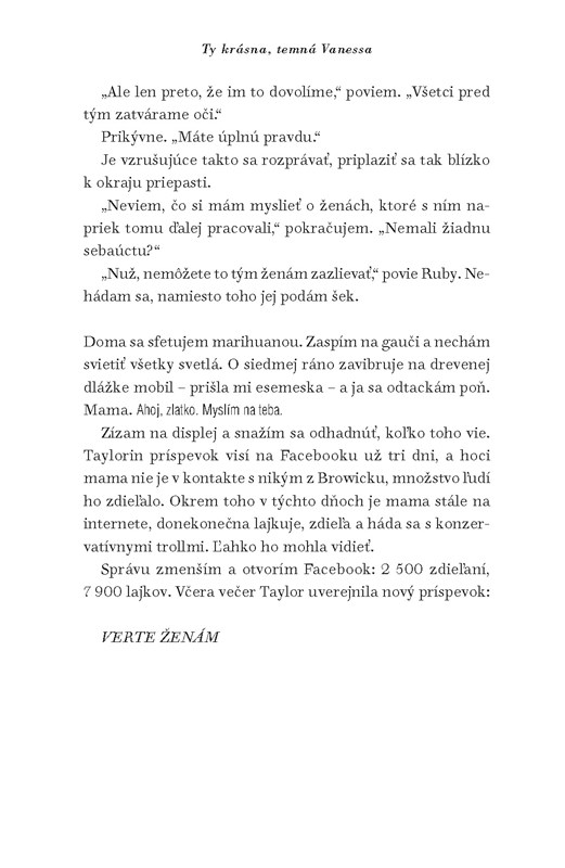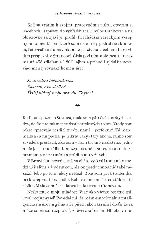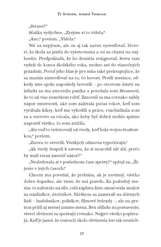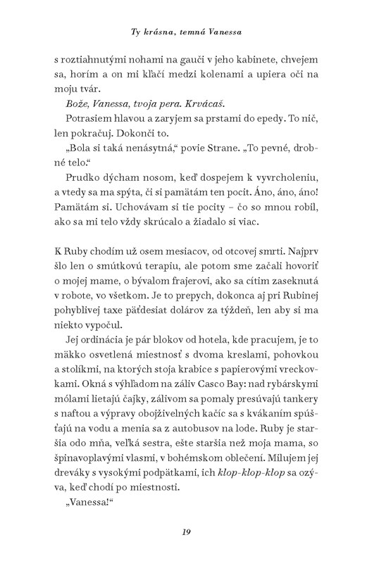 Vraciame sa do minulosti a začína sa odvíjať desivý príbeh manipulátora a obete. Hrôza a ešte raz hrôza. Nevedela som, či mám plakať, zúriť alebo hľadať čarovný prsteň, ktorý ma prenesie za tou nešťastníčkou, aby som ju mohla zachrániť. Od prvej vety, ktorú vyslovil, sa mi hnusil. Veľmi inteligentne ju omámil rečami a už nebolo cesty späť. Nevadí, že sa jej sem-tam niečo nepáči, ostatné je skvelé, má ochrancu, hovorí o nej, že je úžasná, jediná, jeho temná Vanessa… Hoci ju neskôr zradil nečakaným spôsobom, stihol si ju omotať okolo prsta tak, že sa z jeho pazúrov nedokáže vyslobodiť ani ako dospelá. Brodí sa „špinou“, obviňuje sa, ľutuje, vo svetlých chvíľach si, naopak, uvedomuje, čo spravil, no o hodinu sa vracia k pevne zakoreneným pocitom. Odpor a pochybnosti, ktoré sa jej z času na čas zmocňujú urputne potláča. Súcitila som s ňou po celý čas. Hoci o tom, čo sa stalo, keď bola dieťaťom, vedeli mnohí, nik jej nepomohol. Učitelia aj rodičia privreli oči. Ona sama pomoc odmietala a chránila tajomstvo ako oko v hlave. Dokáže konečne po obvineniach inej študentky všetko prehodnotiť a oslobodiť sa od myšlienok, ktoré jej vštepil do hlavy?