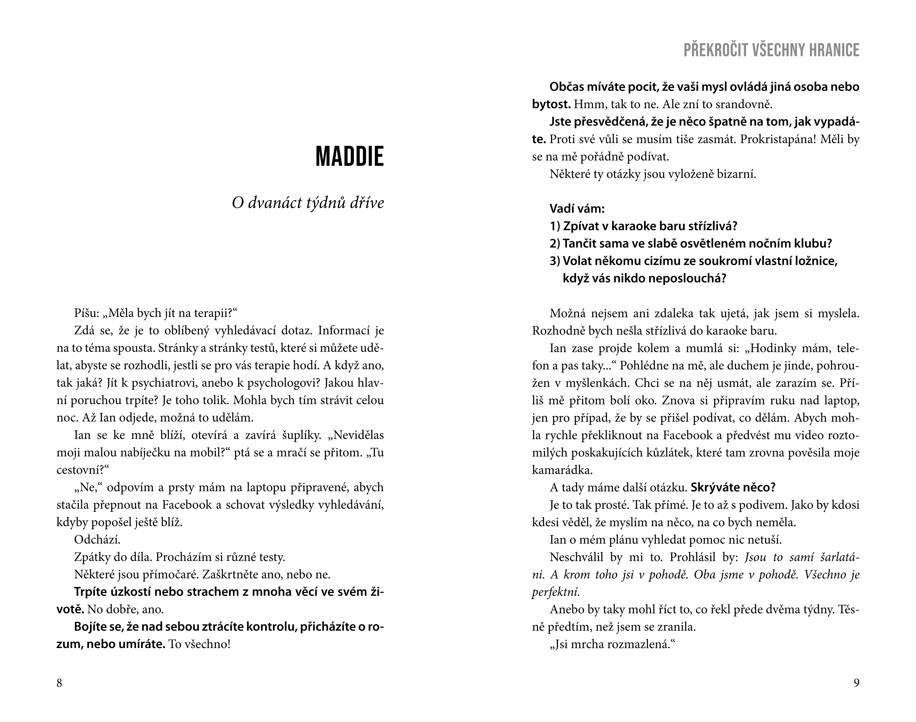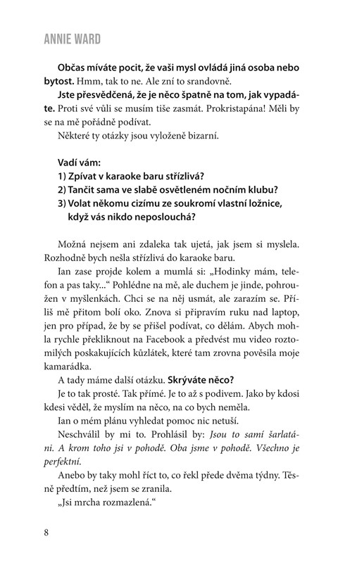 Věci, které mě děsí: Když Charlie pláče. Když se Ian neprobouzí. Když někdo střílí děti ve škole. Maddie Wilsonová má za sebou těžký úraz, který zanechal trvalé následky. Součástí léčby je i psychoterapie, při níž Maddie postupně odhaluje všechny svoje strachy. Bojí se svého manžela Iana. Má velké obavy o bezpečí malého syna Charlieho. Úzkost v ní vyvolává také konec letitého přátelství s dobrodružnou kamarádkou Jo. Někdy mám hrůzu i sama ze sebe. Cítím, že je se mnou něco úplně špatně. Jsem pokřivená. Seznámili se před šestnácti lety na divokém Balkáně, kde každý z nich plnil jinou misi. Pak se Maddie přesunula za klidnějším životem do New Yorku, zatímco Ian se jako voják a špičkový kontraktor pohyboval na nejkritičtějších místech planety. Když se po dlouhé době znovu setkali, rozhodli se uzavřít manželství, nechat překonaná traumata za sebou a normálně žít. A kde jinde by mohli najít klid, než v idylickém venkovském domě? Kdy se to všechno takhle hrozivě zvrtlo? Po šestnácti adrenalinových letech si nepřáli nic než klid. Tak proč musely všechny jejich dobré úmysly skončit vyděšeným telefonátem na tísňovou linku, policejními vozy a tratolištěm krve? Proč musel nastat Den zabíjení?
