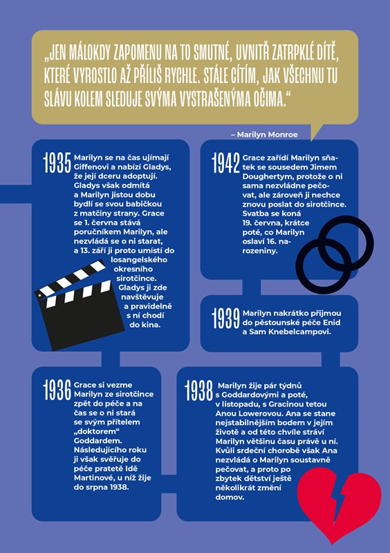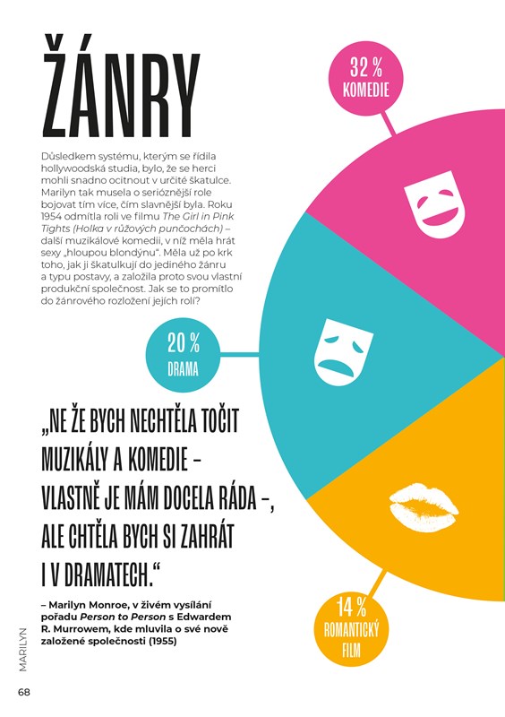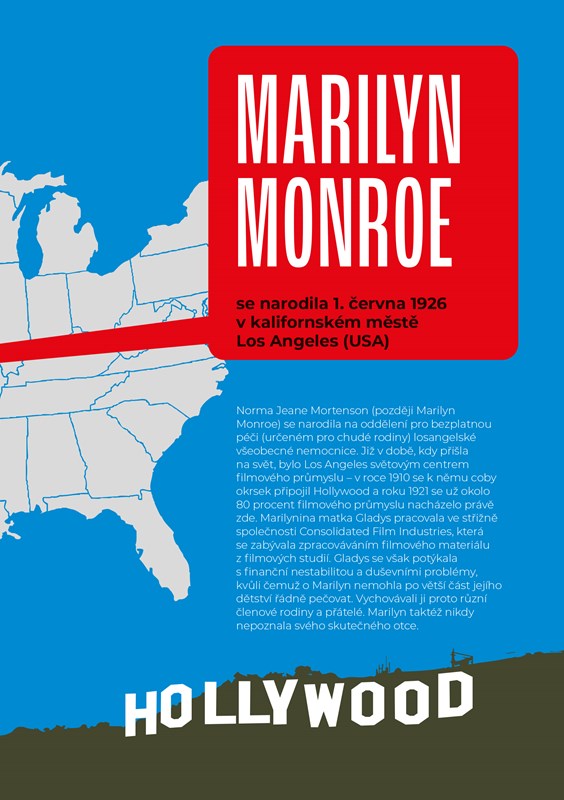 Většina lidí zná Marilyn Monroe (1926–1962) jako ikonu Hollywoodu a jednu z nejslavnějších hereček této planety. S postavou nezapomenutelné blondýnky se však pojí spousta zajímavých faktů, které vám její osud a životní cestu představí ve zcela novém světle. Věděli jste například, že během svého nedlouhého života vystřídala až 43 různých bydlišť? Že v Koreji zpívala před publikem čítajícím 100 000 vojáků? Že byla vášnivou čtenářkou a v době své smrti měla rozečtenou kultovní knihu Jako zabít ptáčka od Harper Lee? Nebo že se vzepřela tlaku hollywoodských studií a založila si vlastní produkční společnost, díky níž se stala první ženou filmového průmyslu, která vlastnila majoritní podíl takto velké firmy?