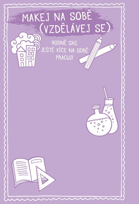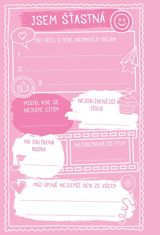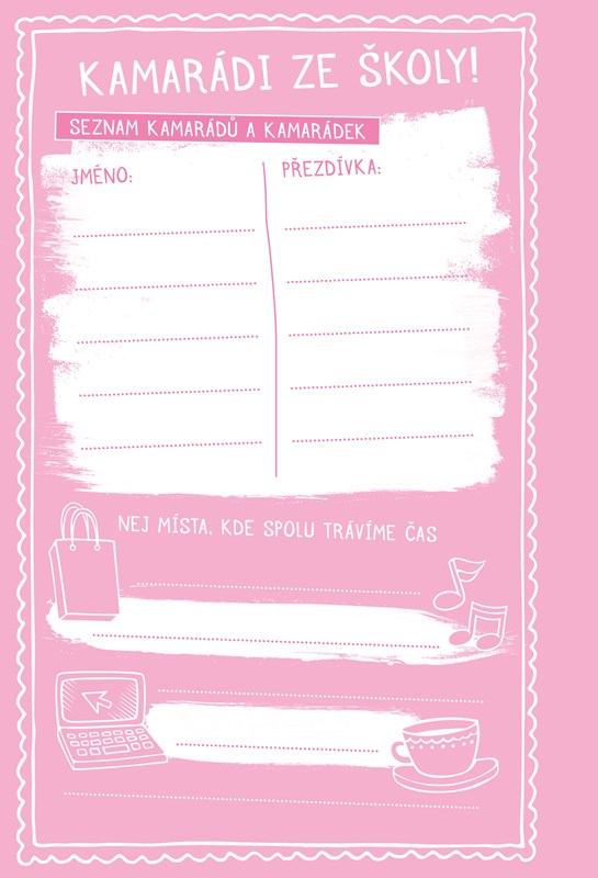 V zadní části pak najdeš stránky s různými tématy, na které můžeš psát, lepit fotky a suvenýry jako třeba vstupenky, diplomy a dopisy – cokoliv si budeš chtít uchovat a připomenout po letech.