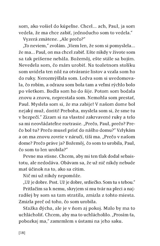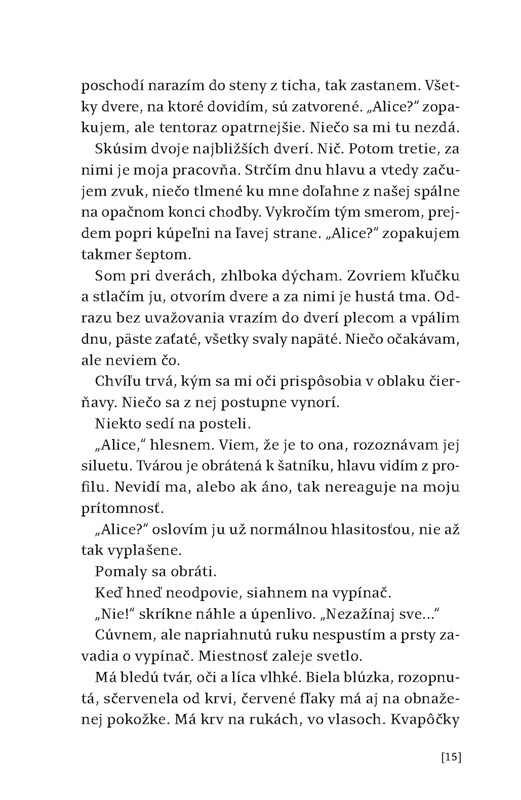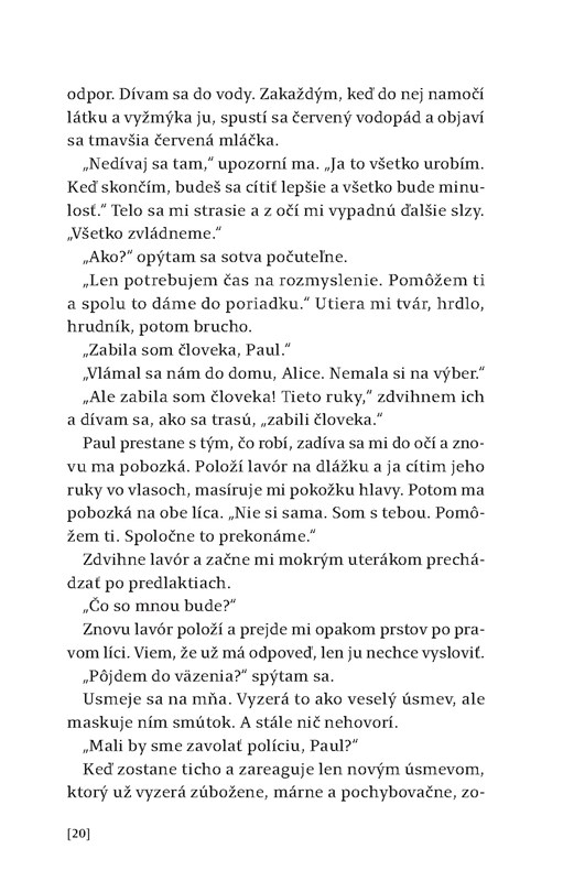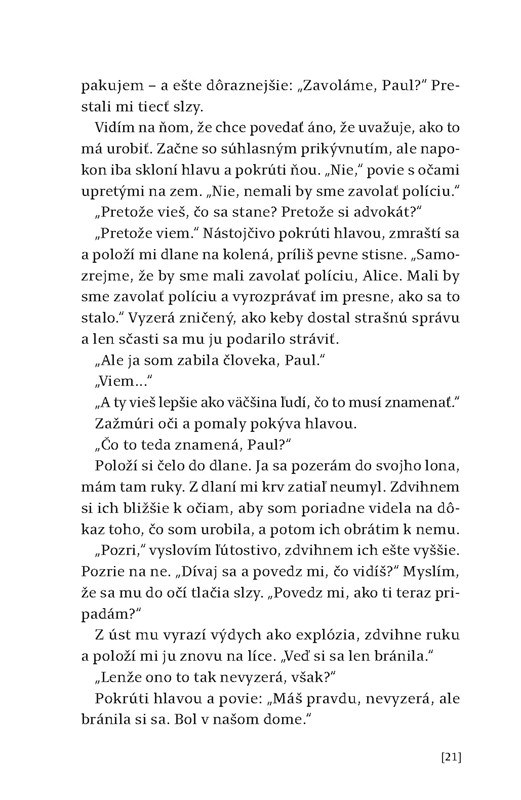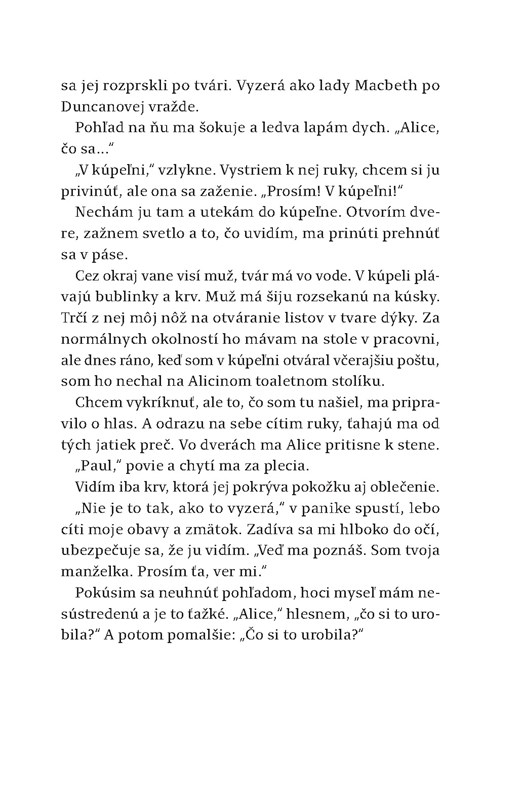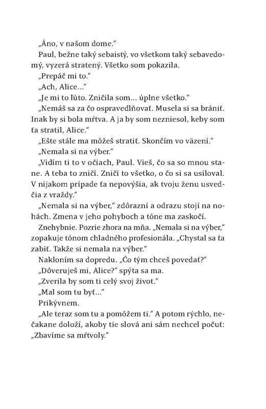 Román kladie pred čitateľa ťažkú otázku. Áno, každý by pre milovaného človeka urobil možné aj nemožné. No dokázali by sme spraviť to, čo hlavní hrdinovia? Na postave Paula vidíme, že by sa hrozná situácia možno dala zvládnuť, no Alice je jasným dôkazom rozkladu osobnosti. Ku koncu som ju už nespoznávala. Vlastne, aj oni dvaja sa navzájom stali cudzincami. Raz zaklameš v podstatnej veci a už nikdy nenájdeš pokoj. Na jedno klamstvo sa nabaľujú ďalšie a ďalšie a zo vzniknutej pavučiny je náročné sa vymotať. Komu veriť a komu nie? Ich psychika je v takom stave, že neveria ani jeden druhému. A čo je najvzrušujúcejšie, už ani čitateľ nevie, kde je pravda. Bolo fascinujúce pozorovať premenu a vývoj postavy vinníčky. Čitateľ sa s ňou dokáže stotožniť, chápe ju, no ako príbeh naberá na obrátkach, Alice môže stratiť vaše sympatie. Mala som sto chutí ňou zatriasť.