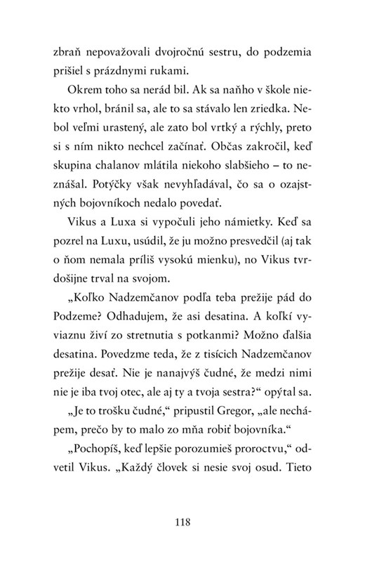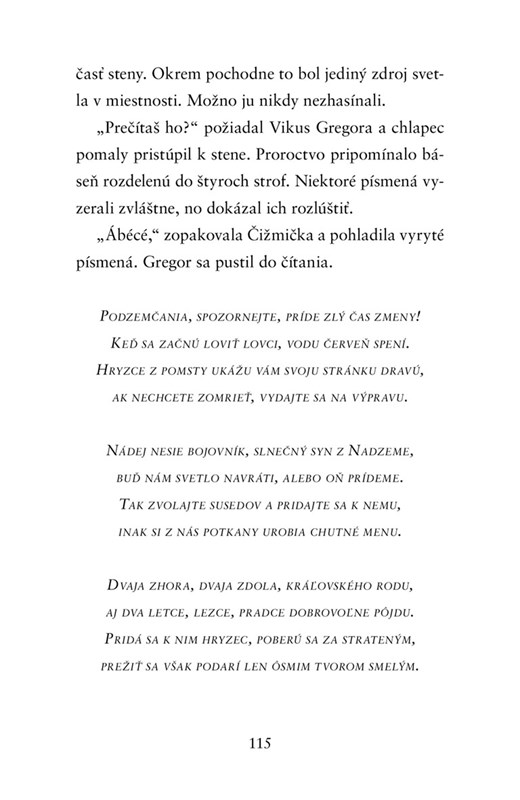 Namiesto toho, aby Gregor strávil leto s kamarátmi v tábore, sa musí starať o dvojročnú sestru Čižmičku, ktorá rozpráva ako malý mimozemšťan. Jedného dňa sa Čižmička prepadne cez rošt v práčovni a zmizne. Gregor sa vrhne za ňou a spolu sa ocitnú v tajomnom svete – Podzemi. Ľudia v ňom žijú s pavúkmi, potkanmi a so švábmi, ale krehký mier sa môže každú chvíľu zmeniť na otvorenú vojnu. Gregor nemá v úmysle zapojiť sa do diania v tomto zvláštnom svete. Čoskoro však zistí, že staré proroctvo predpovedalo jeho príchod a osud Podzeme je v jeho rukách. Ak bude nasledovať znenie veštby, môže navyše vyriešiť najväčšiu záhadu svojho života – nájsť strateného otca...
