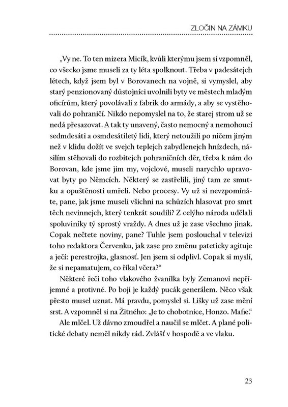 Mysleli jste, že vás major Zeman už nemůže ničím překvapit? Že znáte všechny jeho případy? A co když existuje ještě jeden?! Ten poslední… Brutální vražda mladé dívky, jejíž tělo bylo nalezeno v blízkosti zámku, kam si straničtí funkcionáři jezdí vyhodit z kopýtka. Dekadentní lovy zvěře z vrtulníku, dámská společnost a opulentní hostiny, jimž papaláši holdují, jako by Janu Zemanovi těsně před penzí sundaly růžové brýle. K nedořešenému případu se vrací ještě po letech. Proč musela dívka zemřít? Před čím utíkala a kdo ji zabil? Hledání odpovědí prověří Zemanovu loajalitu k režimu až k jejím kořenům.