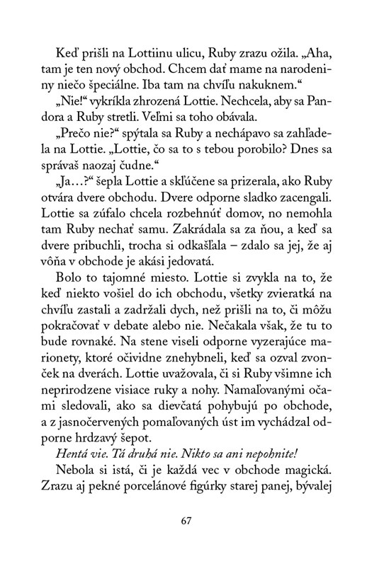 Čarovné dobrodružstvá jedenásťročnej Lottie pokračujú! Je veľmi šťastná, že môže bývať v obchode s chovateľskými potrebami svojho strýka a rozprávať sa so zvieratkami, ktoré tam žijú. Sama pritom zdokonaľuje svoje schopnosti. Do ulice sa však nasťahuje nová susedka, ktorej čarodejnícke schopnosti sú mocnejšie než Lottiine a ktorá rada spôsobuje problémy. Obchod Lottiinho strýka má však nového obyvateľa – škrečka Gilesa, ktorý je ochotný pomôcť. Lottie má šťastie – jej nový priateľ je totiž veľmi odvážny a nenechá sa zastrašovať!