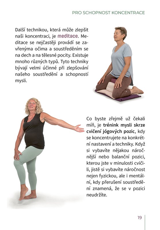 Také se naučíte zdravě dýchat, abyste dostatečně zásobovali své tělo kyslíkem, odstraníte stres, příjemně se uvolníte. Oční jógou odstraníte bolesti hlavy a únavu očí, obličejovou jógou si udržíte svěží vzhled. Autorka vám také poradí, jak si procvičit paměť a zvýšit schopnost koncentrace.