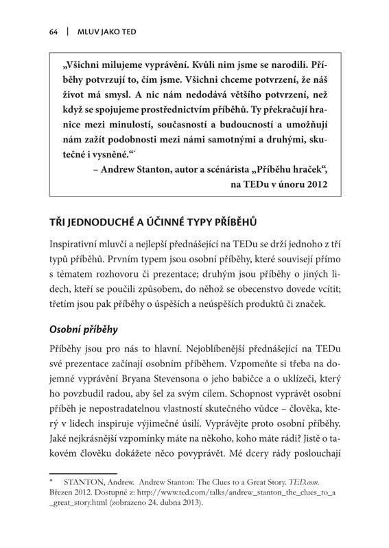 Nestačí mít skvělé myšlenky a nápady. Abychom uspěli, musíme umět své nápady prodat. To je dovednost, která otevírá bránu ke splnění našich snů. Dobře zabalené a podané myšlenky mohou změnit svět. Někteří lidé jsou v prezentaci svých myšlenek výjimečně dobří. A my ostatní se tomu od nich můžeme naučit. Tato kniha odhaluje techniky nejlepších TED speakerů z celého světa. Mluv jako TED poslouží každému, kdo chce udělat skvělou moderní prezentaci na jakékoliv téma; šířit zajímavé nápady; svým projevem „chytit posluchače za srdce“; mluvit s větší sebejistotou a beze strachu nebo dodat své prezentaci přirozený spád.