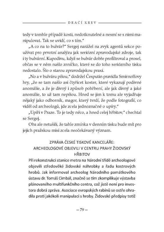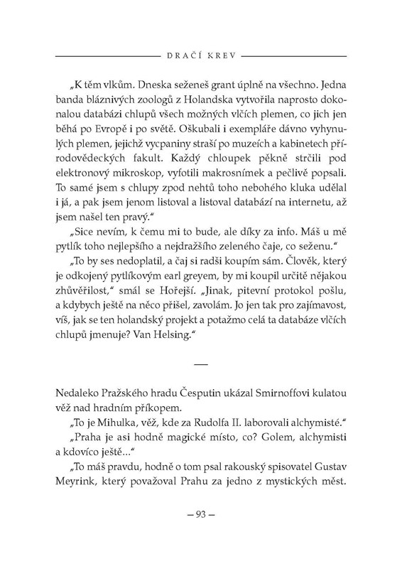 Jak souvisí zrůdné nacistické experimenty s pokusy rudolfinských alchymistů? Kdo odhalí šifru nejzáhadnějšího rukopisu světa? Kdo unáší a vraždí mladé turecké chlapce? Co se ukrývá na starém židovském hřbitově v centru Prahy? Klíčem nejen k těmto záhadám je Dračí krev, jejíž tajemství střeží kult, jenž po staletích života ve stínu znovu nabývá na síle a chystá se k útoku.