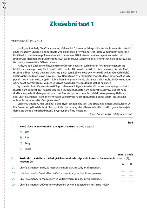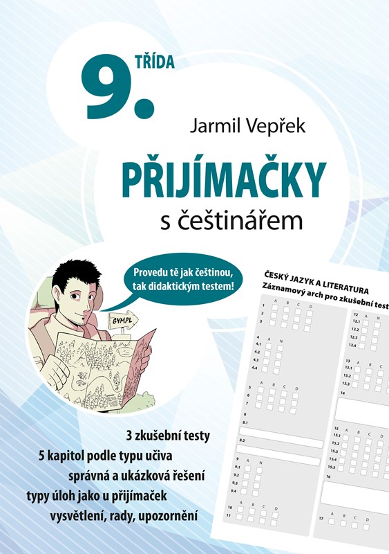 Tato publikace vychází ve třech verzích pro 5., 7. a 9. ročník ZŠ. Žákyně a žáci se v ní díky upozorněním a nápovědám přátelského průvodce (češtináře) dozví, co přesně je čeká u jednotné přijímací zkoušky z českého jazyka. Vhodně zvolená verze příručky může jakémukoli žákovi od páťáka až po maturanta pomoci při všeobecném opakování látky (či její velké části); ostatně, psaní i/y, skladba nebo chápání textu činí problémy všem, zvláště v rychlosti a stresu. V rukou však nedržíte pravidla pravopisu, mluvnici ani pouhý soubor úloh, nýbrž publikaci, která má ze všeho uvedeného něco, a navíc je jak přátelská, tak občas s nejlepším úmyslem náročnější, než by mohla být. To vše proto, že každý zlomek této knížky má jeden hlavní cíl – připravit žáky daných ročníků na didaktický test z češtiny komplexně, originálně a zejména efektivně.