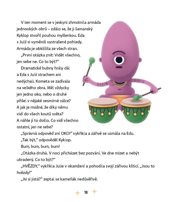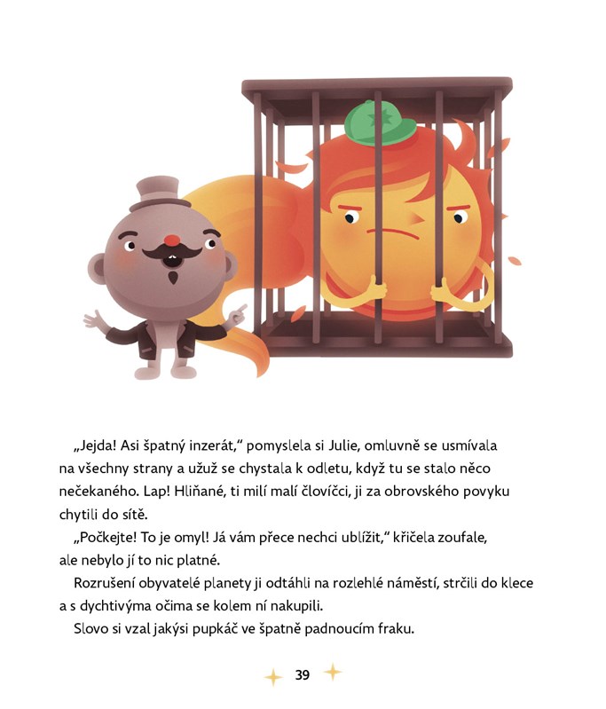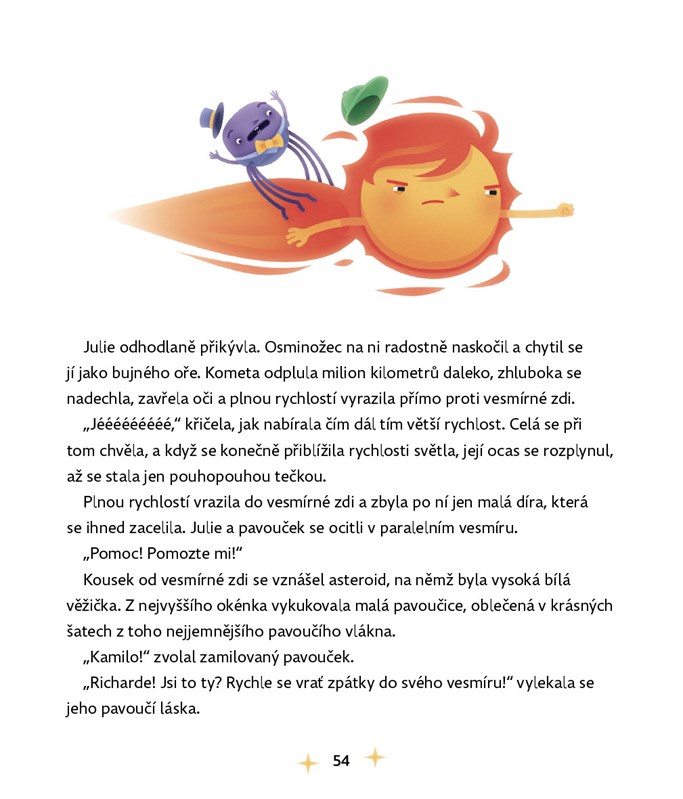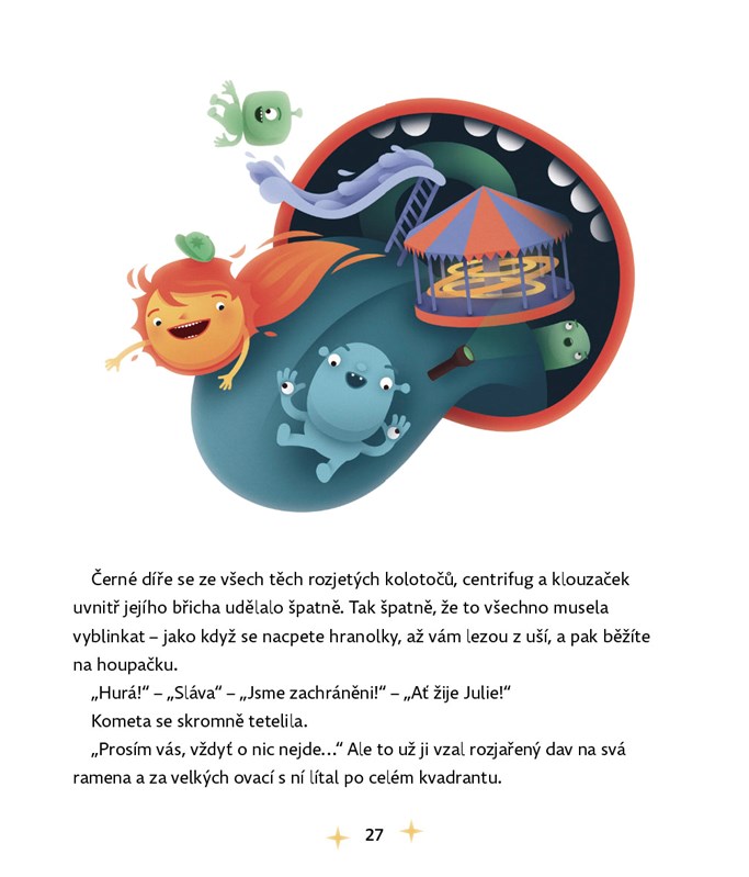 Na noční obloze, až úplně vzadu, v tom nejzazším rohu vesmíru je docela malé, ale jasné světýlko. Vidíte ho? To je kometa Julie. Už tisíce let putuje napříč galaxiemi a zažívá věci možné i nemožné. Potkává bytosti skutečné i neskutečné a zakouší příběhy doslova nadpozemské. Vydejte se společně s ní do útrob Černé díry, na návštěvu planety Hliňanů nebo jí pomozte porazit nebezpečnou kometu Můrii z paralelního vesmíru.