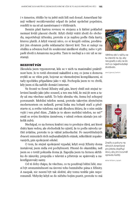 Kdo život v USA zná, může své postřehy porovnat s autorčinými. Koho cesta do Ameriky láká, najde obohacující, někdy legrační, místy pohoršené, občas i dojemné vyprávění o tom, co takový obyčejný život na druhé straně Atlantického oceánu obnáší. A pro ty, co si jen rádi rozšiřují obzory, půjde o poutavě psaný vhled do života za velkou louží. Nechte se překvapit, dojmout i inspirovat.