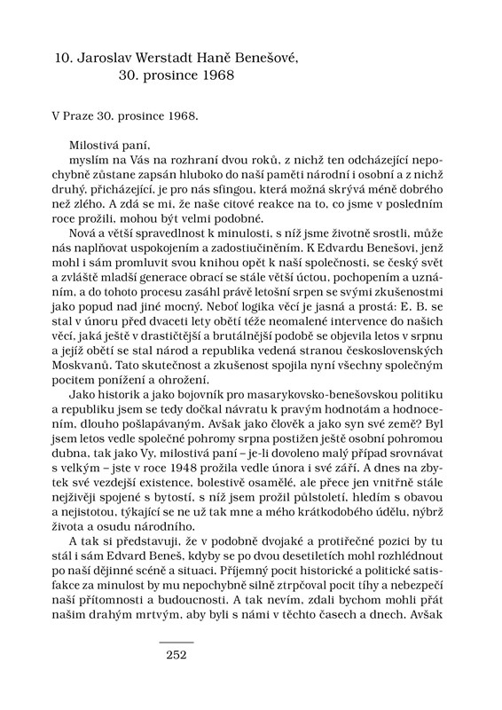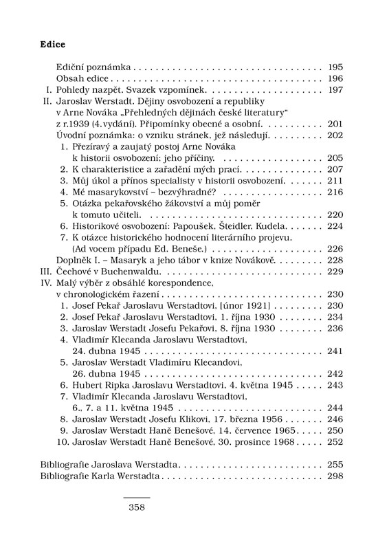 Historik a archivář Jaroslav Werstadt byl výrazným stoupencem prezidentů Masaryka a Beneše. Za první světové války se aktivně účastnil domácího odboje v Maffii, po válce stál u zrodu Archivu národního osvobození. Značné úsilí věnoval teoretickým otázkám i dějinám historiografie, stejně jako okolnostem vzniku Československa. Celé období druhé světové války byl vězněn v koncentračních táborech Dachau a Buchenwald. V roce 1945 se stal – po slavných předchůdcích Josefu Pekařovi a Josefu Šustovi – starostou Historického klubu a v této funkci vytrval i v nastávající nelehké době až do roku 1964. Kniha představuje Werstadtův život i výbor z jeho díla, zahrnující polemiku s literárním historikem Arne Novákem, studii o životě českých vězňů v Buchenwaldu nebo korespondenci s Josefem Pekařem či Hanou Benešovou.