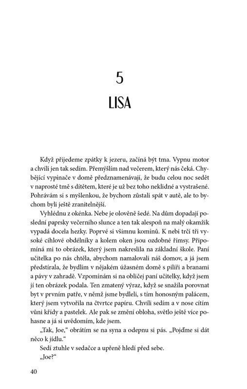Lisa musí zmizet. Hrozí jí nebezpečí od toho nejbližšího člověka, kterému už nemůže věřit. A zdá se, že našla dokonalé místo k úkrytu – starý dům její kamarádky, který stojí u jezera uprostřed yorkshirské divočiny. Dům je na míle daleko od nejbližšího města a nikdo tam o Lise a jejím synovi Joeovi nebude vědět. Aspoň takový byl plán.