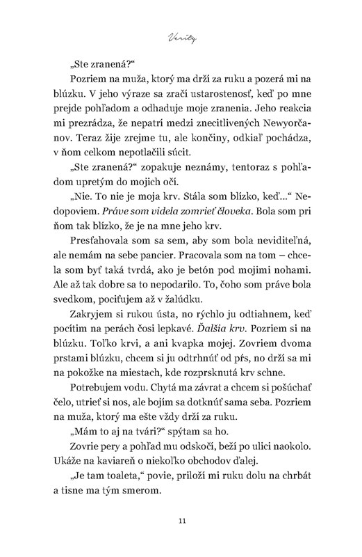 Verity je vskutku vydareným psychotrilerom. Autorka vsadila na to, čo jej ide najlepšie – na navodenie atmosféry a prenesenie emócií na čitateľa. Vďaka tomu stvorila temný a nejednoznačný príbeh, z ktorého ma od určitého momentu permanentne mrazilo. Všetko navyše umocňovala paranoja hlavnej hrdinky, takže o to silnejší bol môj zážitok. Romantická línia v knihe bola našťastie len pridružená a jej pomocou bola psychohra postáv ešte o niečo pôsobivejšia. Najväčší infarkt mi však spôsobilo záverečné odhalenie, vďaka ktorému som začala pochybovať o všetkom, čo som prečítala – pretože ani teraz neviem, čo presne bola pravda a čo lož. Takže touto knihou Colleen Hoover skutočne dokázala, že vie písať aj iný žáner ako romantiku a ja dúfam, že nejaký triler ešte napíše.