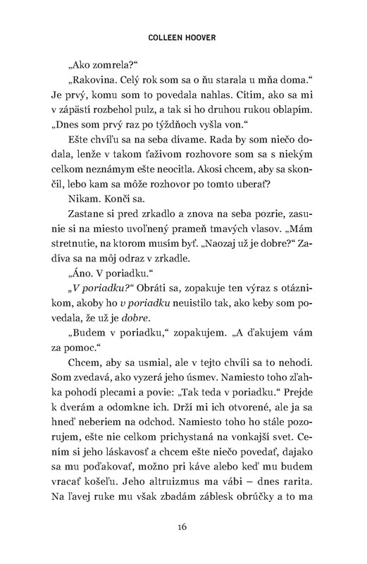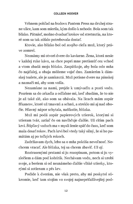 Colleen Hoover je autorka, ktorú mám tak trochu zafixovanú ako kráľovnú romantiky. Keď som sa dozvedela, že napísala triler, bola som zvedavá. Vždy som tvrdila, že každý autor je limitovaný len tým, čo dovolí, aby ho limitovalo a prečo by autorka romantických kníh nemohla napísať triler, ak sa tak rozhodne? Napriek tomu som však netušila, čo presne od knihy čakať. Moje očakávanie teda boli nulové a možno aj preto si ma kniha takmer okamžite získala.