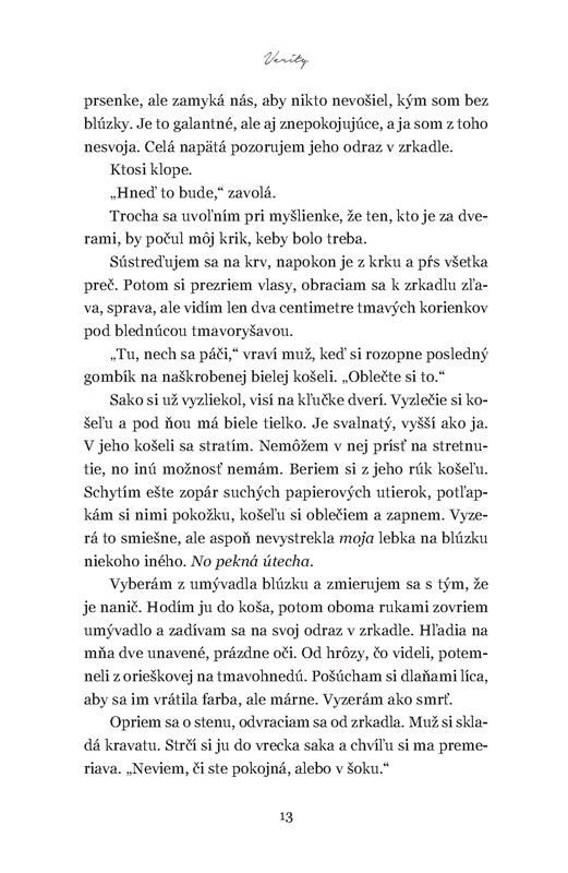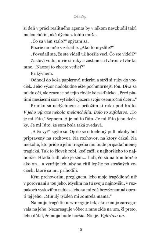 Vyvrcholenie celého príbehu ma však trošku... zarazilo. Prišlo náhle a za ním nasledovalo až podozrivé ticho. Sama seba som sa pýtala, či toto je všetko, čo mi kniha ponúka. No a potom prišlo záverečné odhalenie a mne prakticky vybuchol mozog. Autorka ma dokonale zmiatla. Lebo hoci Verity bola prezentovaná ako nadaná spisovateľka, nebolo úplne jasné, čo všetko dokázala prikrášliť a čo bola pravda. Dokonca ani teraz neviem, kde presne je v tomto príbehu pravda. A to je pre mňa znemenia, že som čítala naozaj kvalitne napísaný triler – pretože aj dlho po jeho dočítaní o ňom premýšľam a pochybujem o všetkom, čo som prečítala.