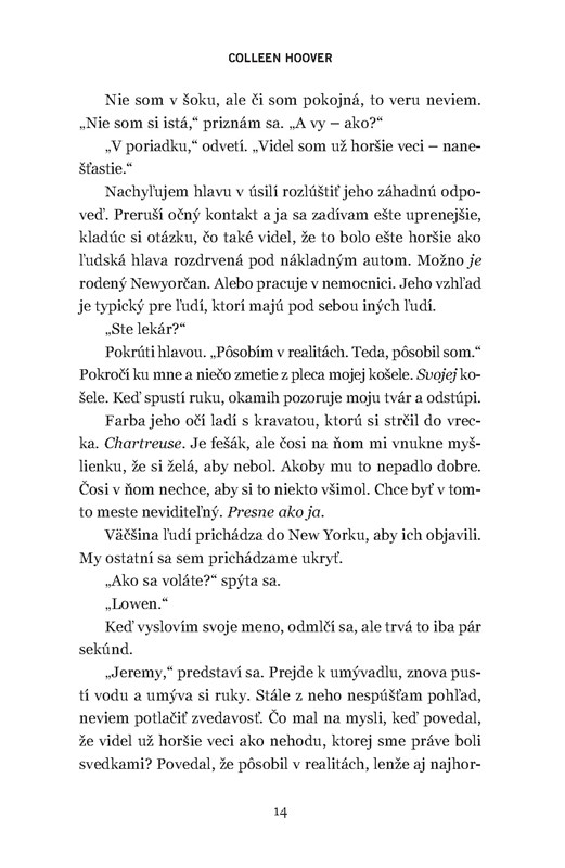 Všetko sa začalo stretnutím hlavných postáv. Lowen aj Jeremy majú za sebou smutné skúsenosti, stratili blízkych a trápia ich mnohé problémy. Takže autorka už od prvej strany dokazuje, že stále dokáže vytvoriť postavy, ktoré od prvého slova dokážu chytiť za srdce. Napriek tomu je ich stretnutie skôr ako vystrihnuté z romantickej knihy – hoci obaja očividne skrývajú mnohé tajomstvá.