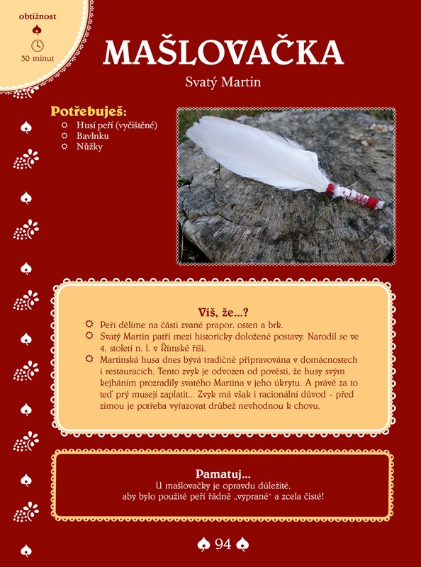 Během předjaří si tak hravě vyrobíte masopustní masky, v období kolem Velikonoc snadno zvládnete pletení pomlázky, po letním slunovratu se pustíte do výroby kukuřičné panenky a o adventu si upečete třípatrovou vánočku.