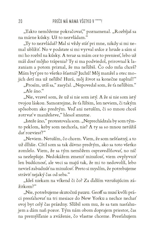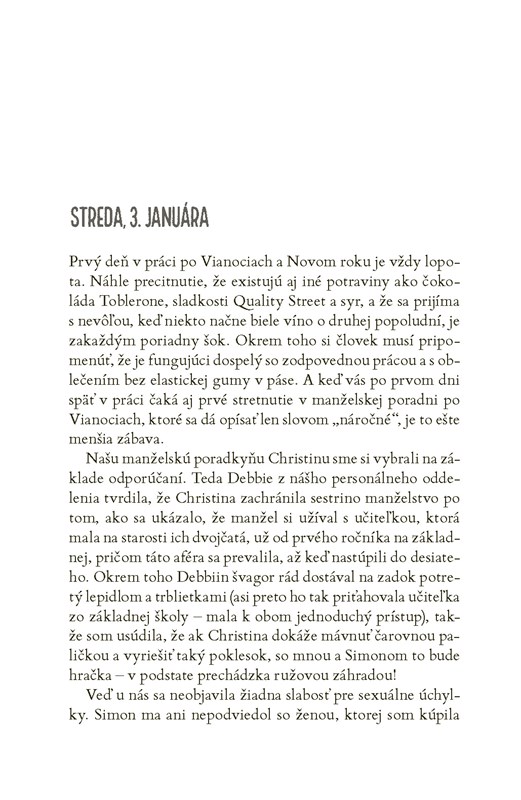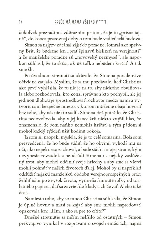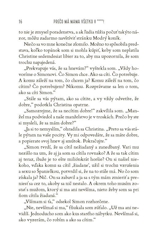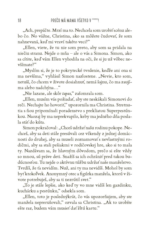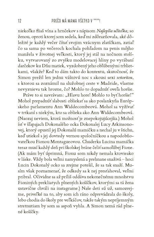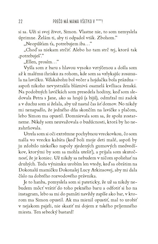A aby toho nebolo málo, zo vzácnych zlatíčok sú teraz desiví tínedžeri. Celé dni a noci trávia na snapchate, bezcieľne sa pofľakujú po neveľkej chalupe a komunikujú výhrade vrčaním – teda až na prípady, keď práve od mamy nepožadujú taxikárske služby v skorých ranných hodinách alebo nestrúhajú prehnané pózy a grimasy do svojich príbehov na instagrame. V dome stále chýba mlieko a nenásytný Peter v momente zhltne každé jedlo, ktoré sa ocitne v jeho zornom poli.