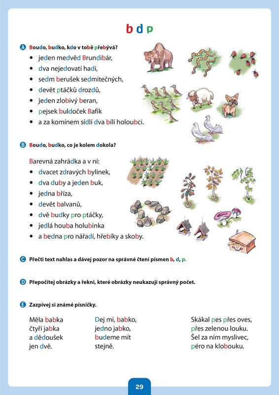 První část publikace je věnována psaní, vnímání tvarů jednotlivých písmen a jejich porovnávání.
