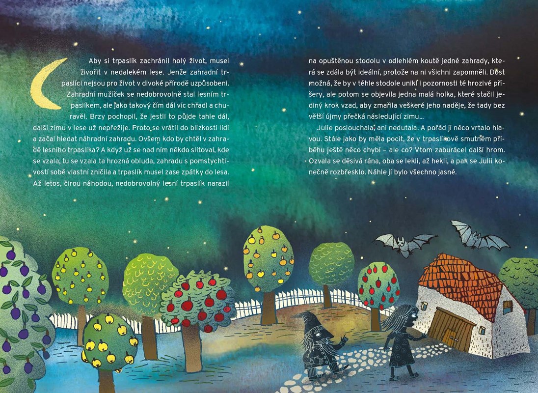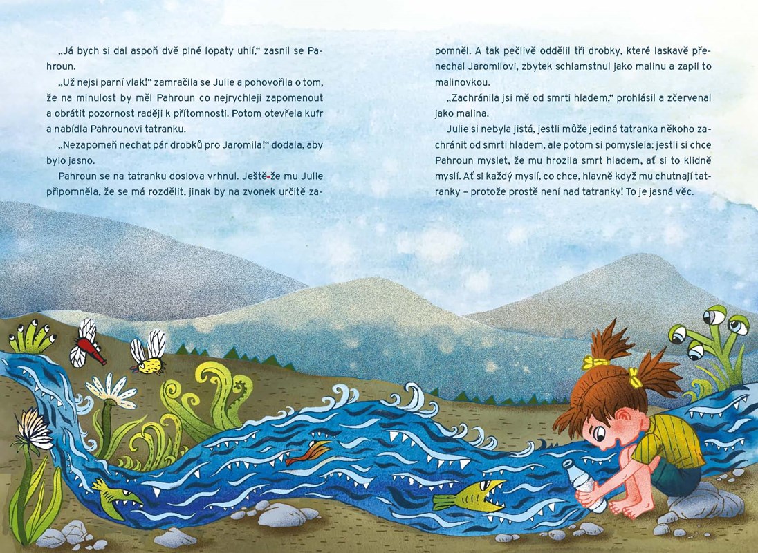 Julie je holka dobrodružná, a tak se vydává na cestu za svojí tetou do Smrdákova, kam prý jezdí jen lidé padlí na hlavu. Není proto divu, že dívce na její cestě dělají společnost prazvláštní bytosti – bývalý vlak jménem Pahroun, luční zvonek Jaromil Modrovlas, který chtěl být odjakživa umělcem, a věčně pochybovačný (a taky dávno snědený) salát. A když se k tomu přidá parta veselých veverek, nějaká ta tatranka a staré natahovací hodinky, je u toho i velký kopec srandy. Pohádková literární road movie, která přivádí dětského čtenáře do říše fantazie, kde nic není nemožné, ale všechno je uvěřitelné.