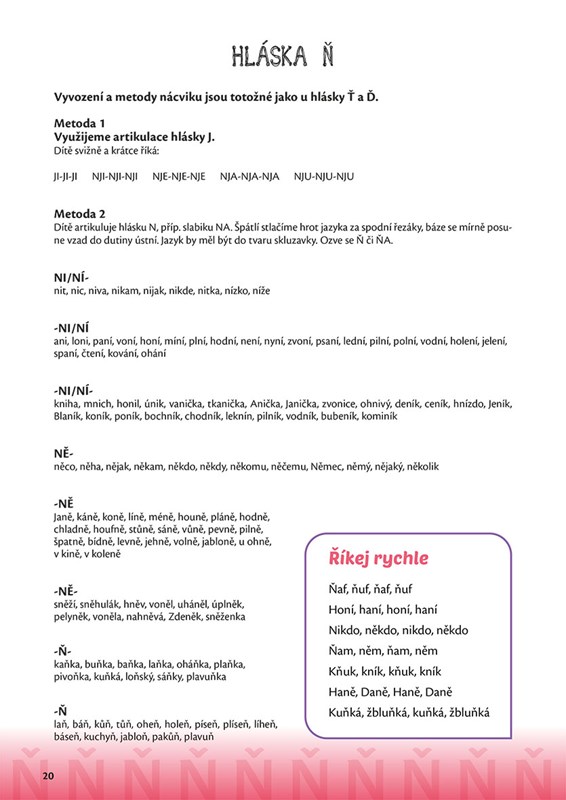 Publikace Naučte své děti říkat Ď, Ť, Ň je určena především rodičům pro domácí procvičování problematických hlásek s dětmi, ale i odborníkům z řad logopedů, speciálních pedagogů či učitelům v mateřských školách. Autorka Irena Šáchová, která čerpá ze své dlouholeté praxe klinické logopedky, uvádí ke každé hlásce přehledný a jasný návod, jak při jejím vyvození správně postupovat, a upozorňuje i na častá úskalí při procvičování. Pokynům snadno porozumí rodiče i děti, které knihou provází sympatická postavička logopedky Lucky. Úkoly a cvičení doplňují veselé obrázky Evy Obůrkové. Atraktivní příloha nabízí pět her ke zdokonalení výslovnosti a zpestření procvičování hlásek Ď, Ť, Ň – např. loto, pexeso a domino.