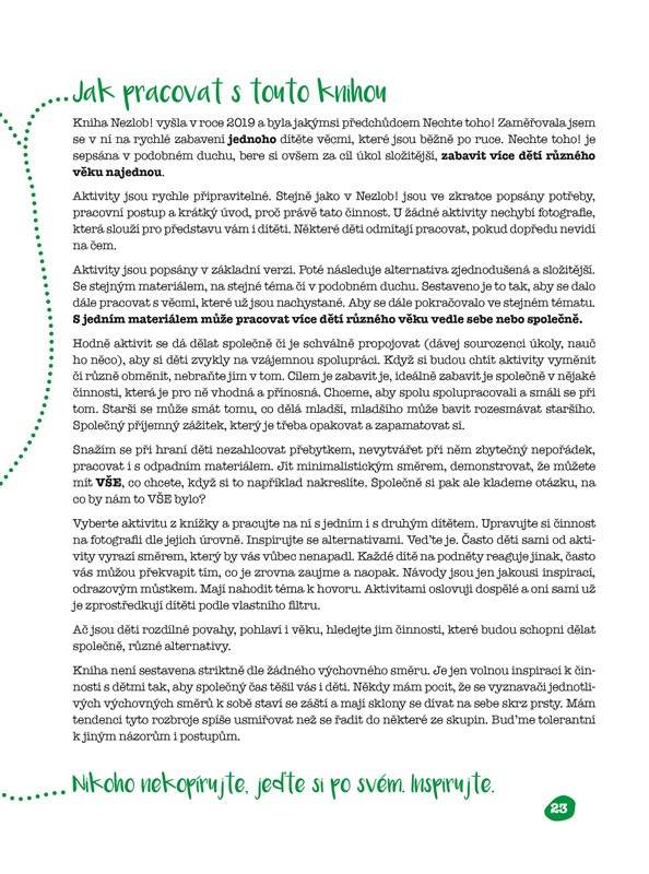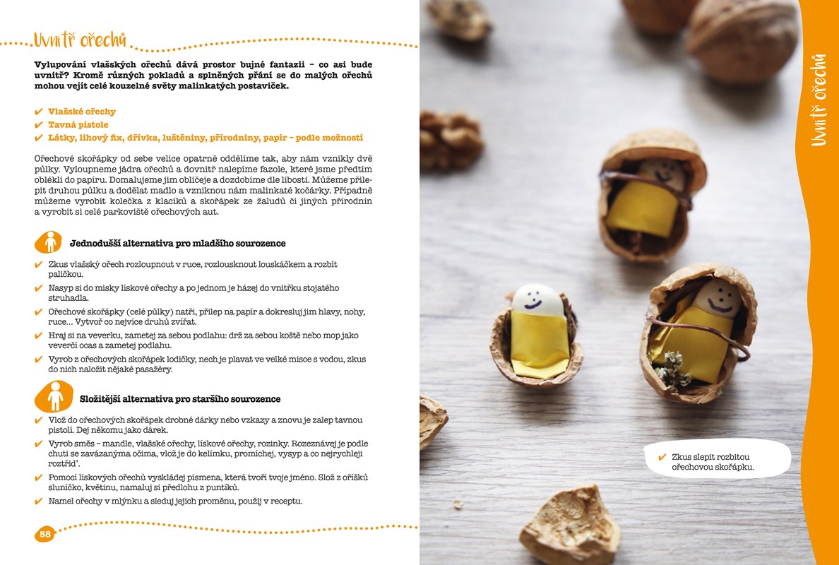 I díky této knize je naučíte pracovat společně i vedle sebe, předcházet konfliktům. Budete tvořit z jednoho materiálu a přitom současně s batoletem i s předškolákem. Naučíte děti činnosti, u kterých je spolupráce cestou k výsledku.