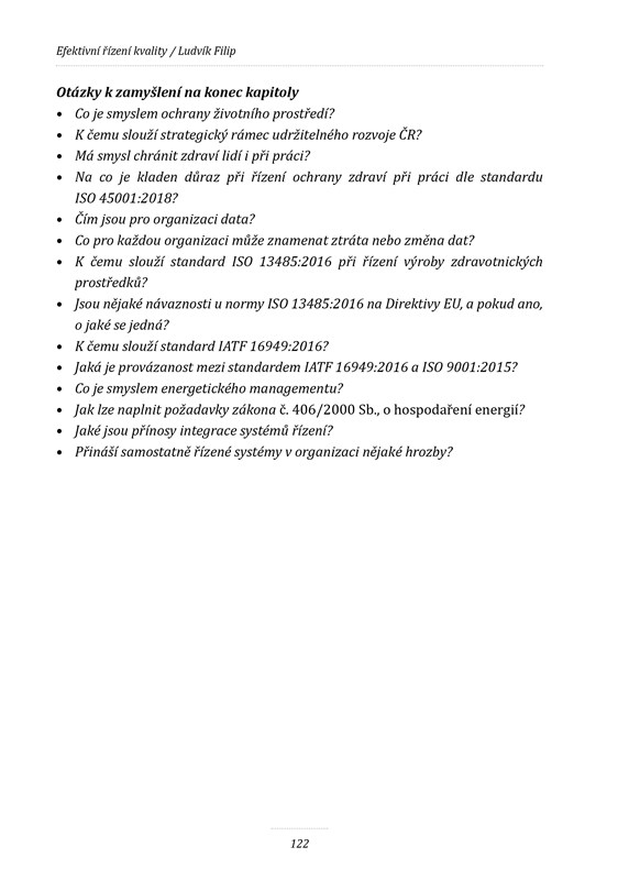 Průvodce správným fungováním v managementu kvality. Publikace je na českém trhu unikátní: obsahuje souhrnné informace o systémech řízení, příklady ze skutečných firem i návrhy správných řešení. Na jednom místě čtenář najde nejběžněji používané, v praxi vyzkoušené metody a aktuální požadavky pro systémové normy. Dozví se, jak metody kvalitně aplikovat, jak zvýšit efektivitu a snížit nákladovost vybudovaného systému.