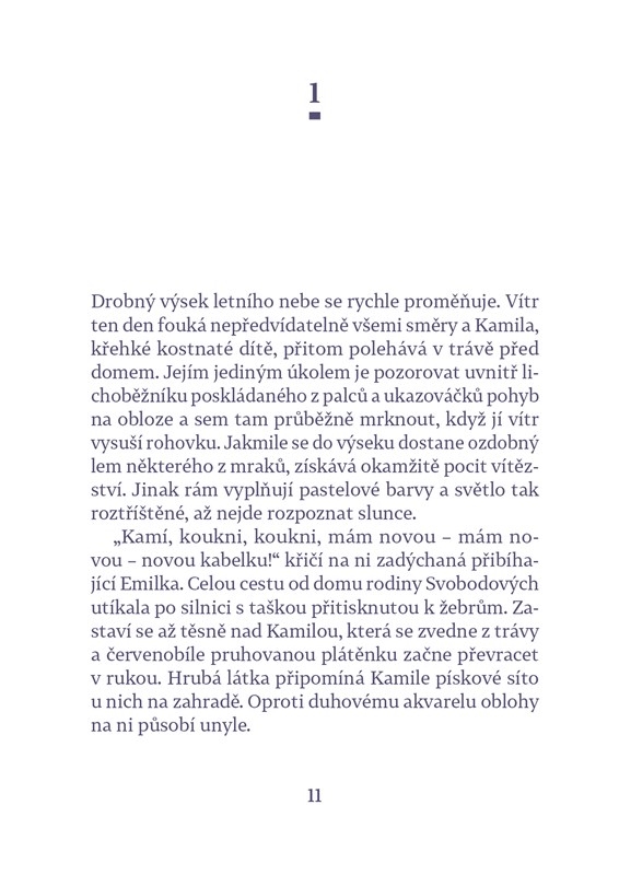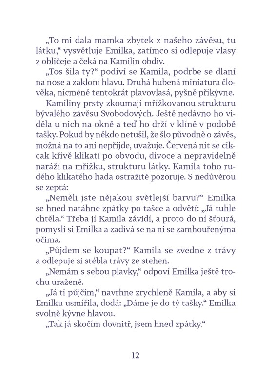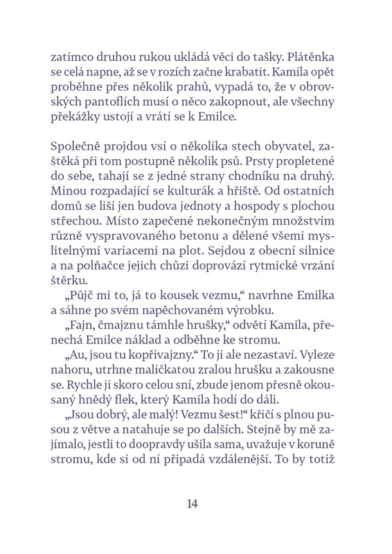 Je lepší alkoholismus nebo snobismus? A co něžná tyranie nedělních návštěv a povinných bábovek? Kamila, Eda a Emilie žijí ve vesnici podomácku slepené ze zbytků starého světa. Její obyvatelé neustále komentují, co si o všech a o všem myslí, jako kolektivní živý bulvár, před kterým není vůbec nikdo v bezpečí. Než dospějí, musí ti tři ještě strčit holou ruku do klubka slepýšů, cucat cíp mokrého ručníku, postavit parádní bunkr. Zbavit se strýcovy neodbytné pracky a opatrně pohladit kostnaté koleno. Vymazat z paměti obraz roztříštěného skla, uzdravit si podlitiny, nenechat se stáhnout do bezedné hořkosti a osamělosti. To samé by ale měli udělat i dospělí. Románový debut lze číst jako průvodce zvětšenými detaily dětských vzpomínek, ponor do složitých mezilidských vztahů a situací, anebo příběh o úniku ze světa nevstřícného ke křehkosti.