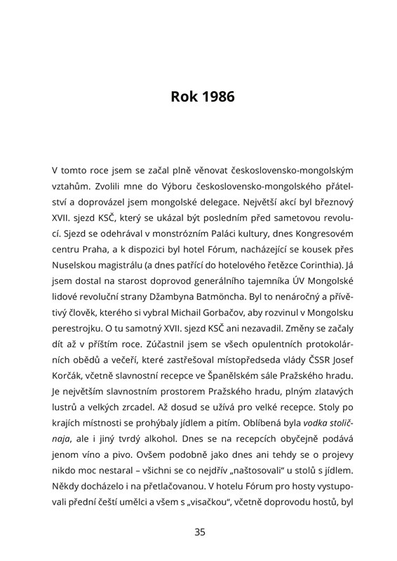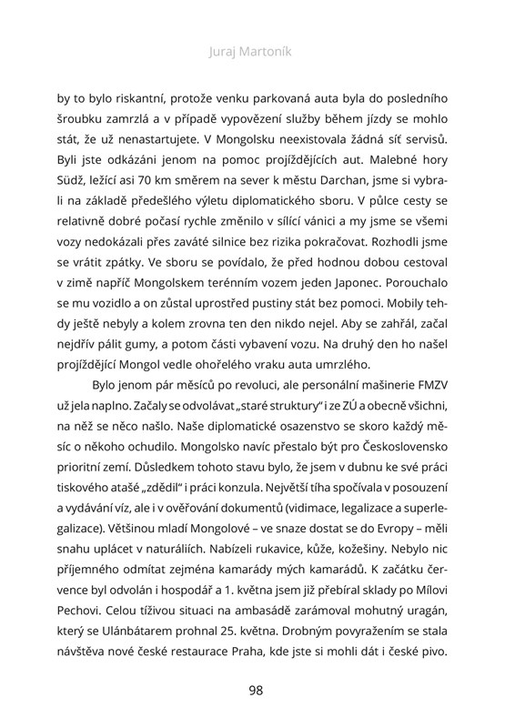 Co obnášela práce začínajícího československého diplomata za socialismu? Jak zvládal „kočovný“ život ve vzdálených a velmi odlišných místech naší zeměkoule, jakými jsou Mongolsko a Austrálie? Co mu přinesla doba po roce 1989, jak se vyrovnával např. s rozdělením Československa? A které události „velkých dějin“ promlouvaly mezi lety 1984 až 2001 do osudů každého z nás? Vzpomínáte si třeba, kdy jste poprvé slyšeli o Černobylu a zda jste se obávali toho, jak asi proběhne dělení republiky?