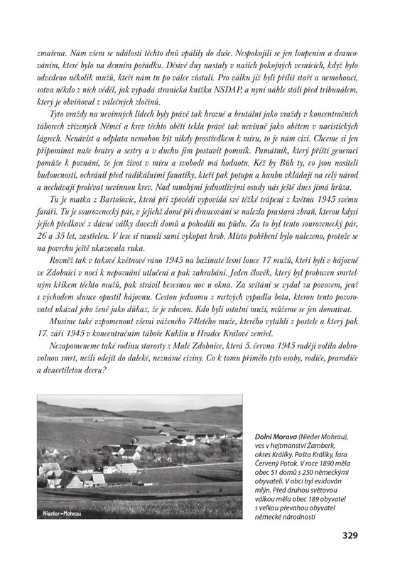 Po rozpadu Rakouska-Uherska zůstalo na nově vzniklém území Československé republiky mnoho národnostních menšin. Daleko nejpočetnější byla menšina německá. V roce 1921 tvořila v ČSR téměř čtvrtinu celkové populace. Češi i Němci vedle sebe žili po několik staletí v přátelské shodě. Zásadní zlom v česko-německých vztazích nastal po nástupu Hitlera k moci v roce 1933. Nepřátelství mezi Čechy a Němci vyvrcholilo po ukončení druhé světové války, kdy docházelo ze strany Čechů k neomluvitelným excesům. Po prožitých útrapách českého obyvatelstva je možné mnohé excesy pochopit, žádné však nelze omluvit. Lze si jenom přát, aby se podobné události již nikdy neopakovaly.