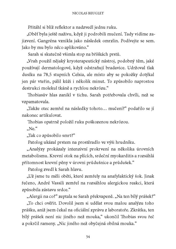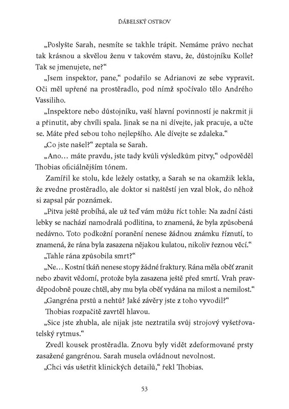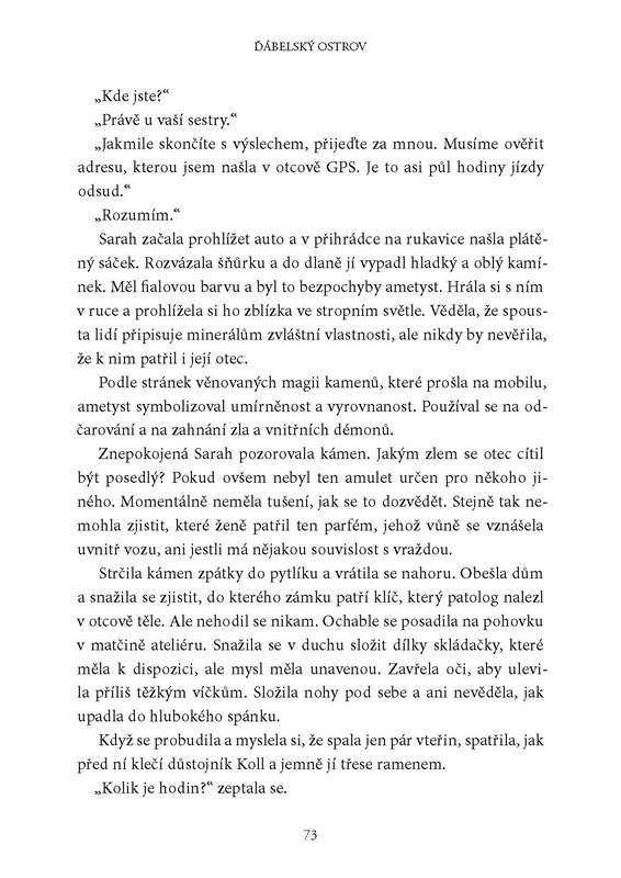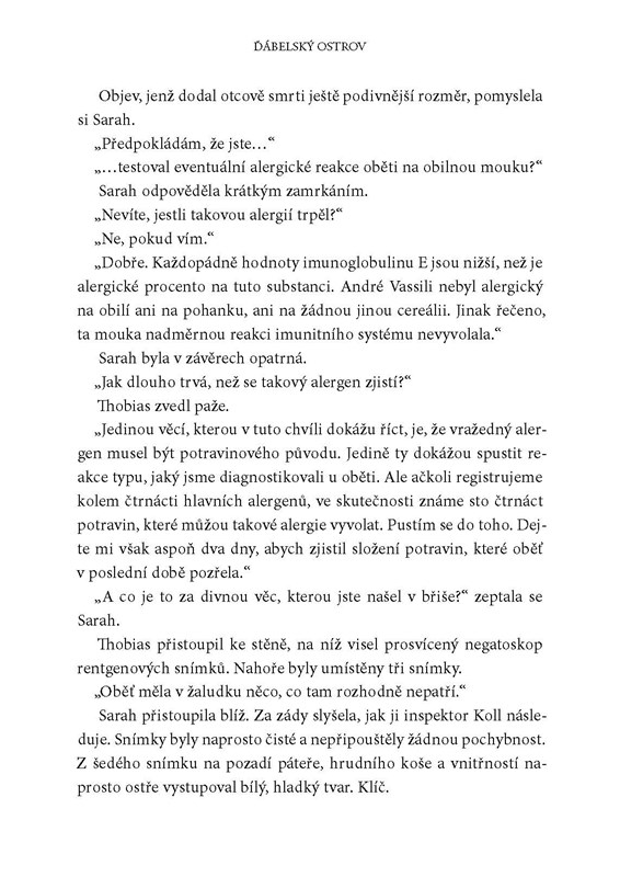 Inspektorka Sarah Geringënová se vrací po vatikánské aféře z vězení a neoficiálně se zapojuje do vyšetřování vraždy svého otce. Ten byl nalezen ve svém domě usmrcen a posypán bílým práškem. Jde snad o rituální vraždu? A co chce pachatel Sarah vlastně sdělit? Při hledání pravdy bude muset inspektorka rozluštit nejedno rodinné tajemství. Byl vlastně její otec tím, za koho se vydával? A co měl společného s Ďábelským ostrovem uprostřed sibiřské řeky, kam vedou všechny stopy? Co se tam kdysi stalo a co se na ostrově, jehož jméno se místní lidé bojí jen zmínit, odehrává dnes? Otázky se množí a odpovědi stále chybí – jen jedno je jisté, Sarah si následky tohoto zločinu ponese do konce svého života…
