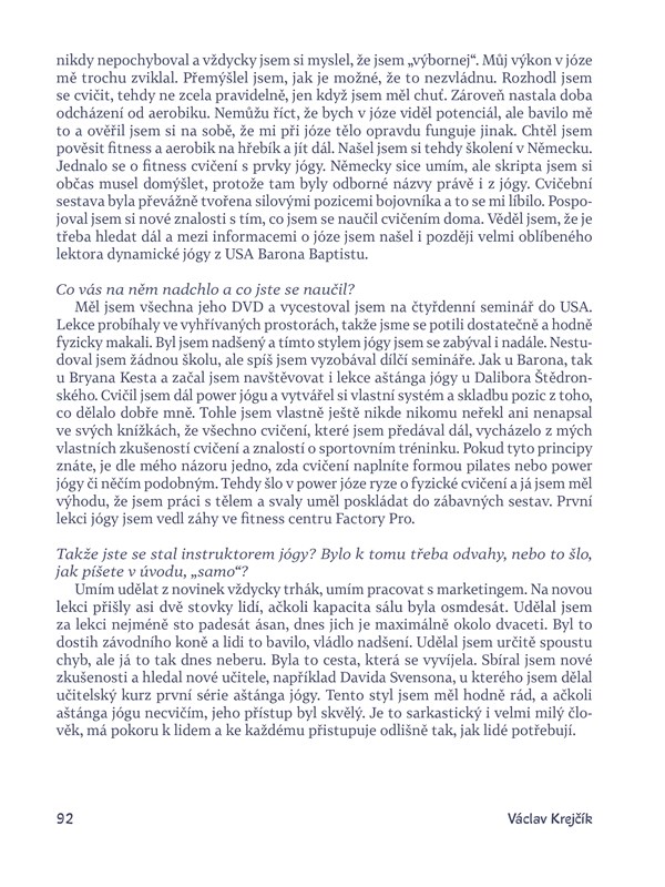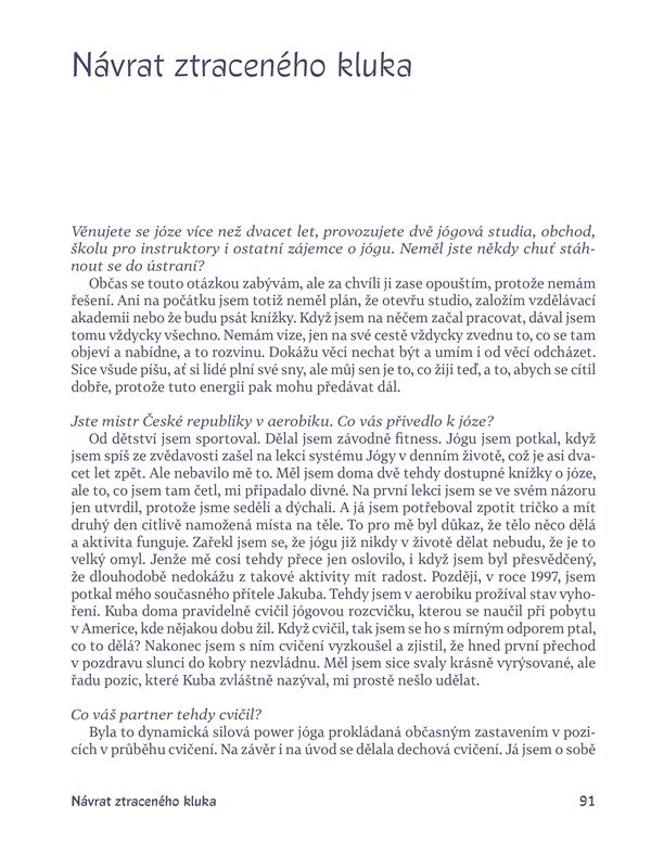 Soubor 24 rozhovorů s nejzajímavějšími osobnostmi, které se v ČR jógou zabývají, včetně starší generace, která u nás s jógou začínala už před revolucí. Jsou mezi nimi Václav Krejčík, Barbora Hu, Karel Nešpor, Lucie Königová, Dalibor Štědronský, ale také Daniela Fischerová, Eda Kriseová a další, kteří mluví o svých zkušenostech s jógou, o tom, čím je obohatila, ale také o různých úskalích, na která ve své praxi narážejí. Osobnosti jsou vybrány nejen napříč generacemi, ale také různými „školami“ a přístupy a výsledkem je tak skutečný průvodce po světě české jógy.
