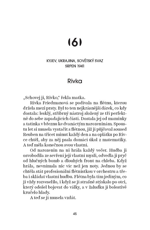 V roce 1941 musí Rifka utéct z Kyjeva dřív, než tam dorazí Němci. Její cesta je obtížná a plná nebezpečí na každém kroku, protože jak Němci, tak Rusové ji zatracují kvůli její židovské krvi.