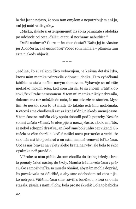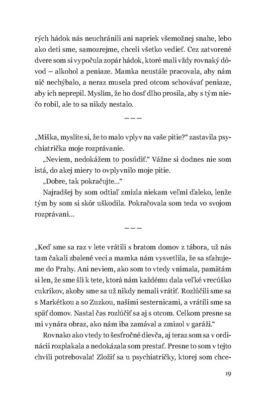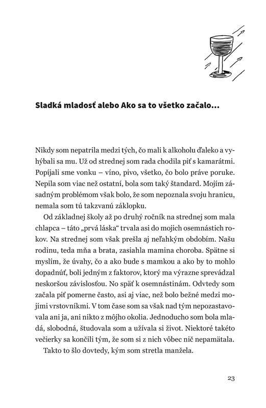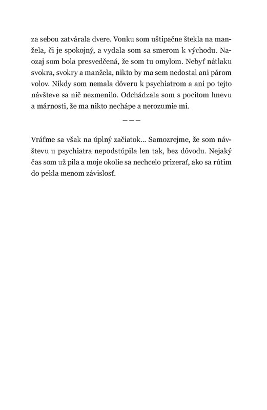 Michaela Duffková je mladá matka, ktorá sa rozhodla otvorene prehovoriť o svojej závislosti od alkoholu aj o zložitej liečbe. Chcete vedieť, prečo je také ťažké priznať si svoj problém s pitím? Prečo nie je prekážkou závislosti ani malé dieťa? Čo bolo pre autorku motiváciou, aby začala s liečbou a ako vyzeral prvý rok po nej?